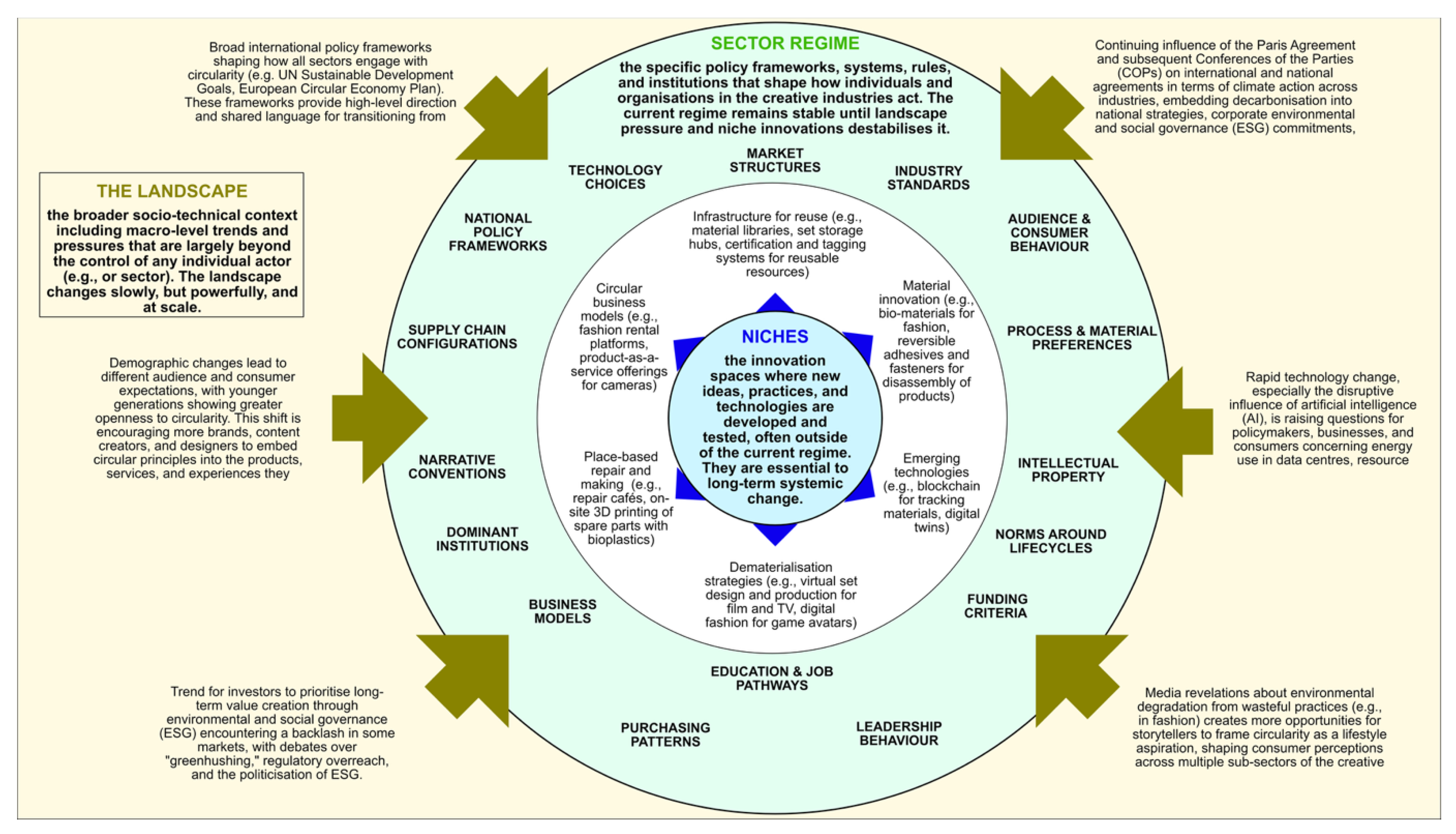 Content associated with the sectoral regime accounts for nearly half of the grey literature reviewed. Much of this material focuses on how specific sub-sectors are responding, or are expected to respond, to climate change and broader landscape pressures for sustainable development. It is uncommon for the creative industries to be examined as an integrated whole; instead, most documents address individual sub-sectors from the perspective of national and local policy, regulatory frameworks, industry-led circularity initiatives, the impacts of digitalisation, and changes to supply chains and infrastructure required for low-carbon or circular operations. The literature also highlights institutional and structural barriers that continue to constrain transition across the sector.