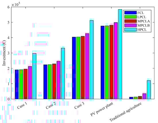 The same trend was observed in cases where land is not free. However, there was an increase in investment costs of 7.19% for traditional agriculture, 0.48% for Case 1, 0.41% for Case 2, 0.23% for Case 3, and 0.19% for the PV power plant in the LPCL scenario compared to the FCL scenario. The MPCLA scenario led to an increase in investment of 41.95% for traditional agriculture, 2.80% for Case 1, 2.38% for Case 2, 1.32% for Case 3, and 1.12% for the PV power plant. The MPCLB scenario led to an increase in investment of 179.8%, 12.03%, 10.22%, 5.66%, and 4.80% for traditional agriculture, Case 1, Case 2, Case 3, and the PV power plant, respectively, compared to the FCL scenario. The HPCL scenario also led to an increase in investment of 851%, 56.93%, 48.36%, 26.80%, and 22.73% for traditional agriculture, Case 1, Case 2, Case 3, and the PV power plant, respectively.