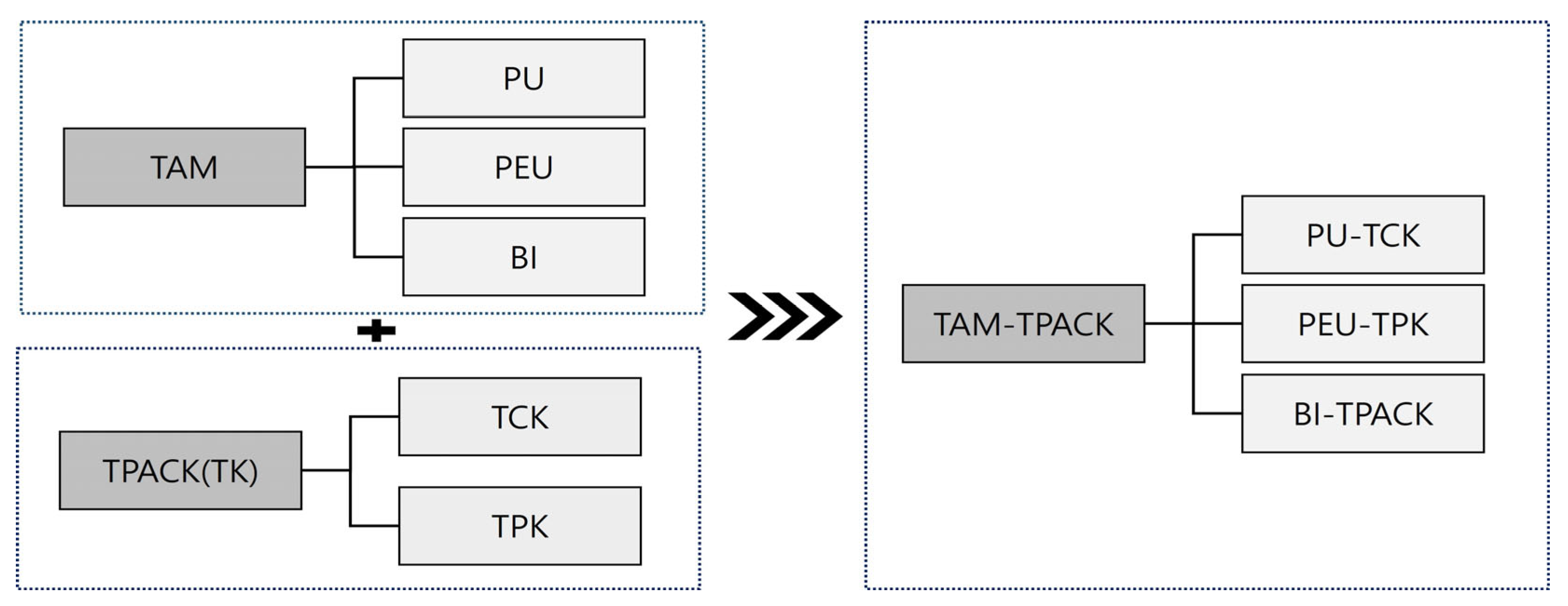 However, bridging the gap between technology acceptance and instructional enactment necessitates a structured understanding of Technological Pedagogical Content Knowledge (TPACK). Specifically, Technological Content Knowledge (TCK) enables teachers to align digital content with curriculum goals and subject matter, while Technological Pedagogical Knowledge (TPK) supports the translation of that content into effective instructional strategies [14,15,16]. From this perspective, an integrative TAM–TPACK approach is essential for resolving the discontinuity between acceptance and pedagogical implementation.