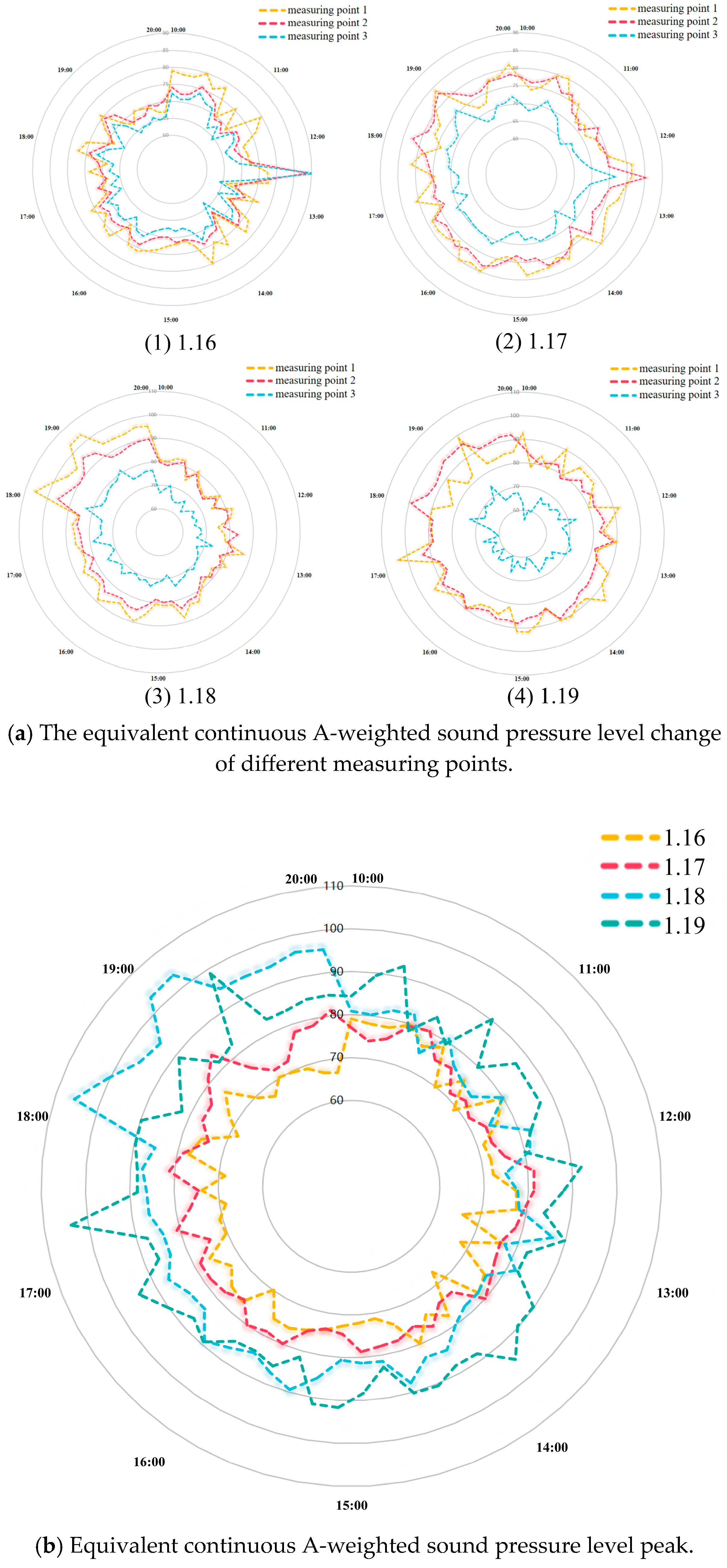 The instrument was placed at 9:00 on the day of the experiment and a 30 min pre-experiment was conducted to test whether the collected data were reliable. Data collection started at 10:00 on time and continued until 20:00. Then the collected data is summarized, the instrument is recovered and the site is cleaned. The study carried out a four-day continuous monitoring from 10:00 to 20:00 on 16–19 January 2025 (1.16–1.17 was a working day; 1.18–1.19 is the rest day). During the experiment, the average outdoor temperature was −0.5 °C.