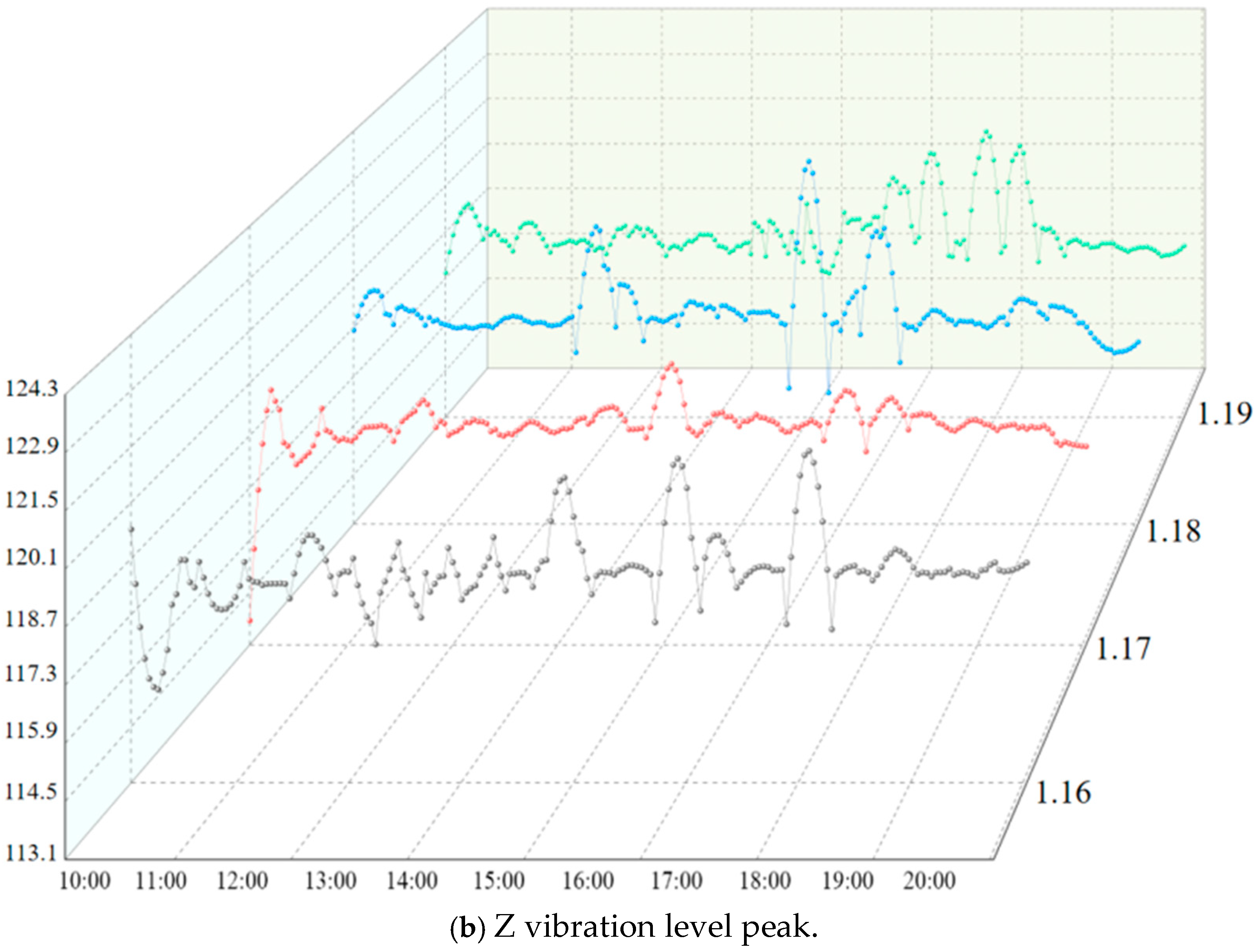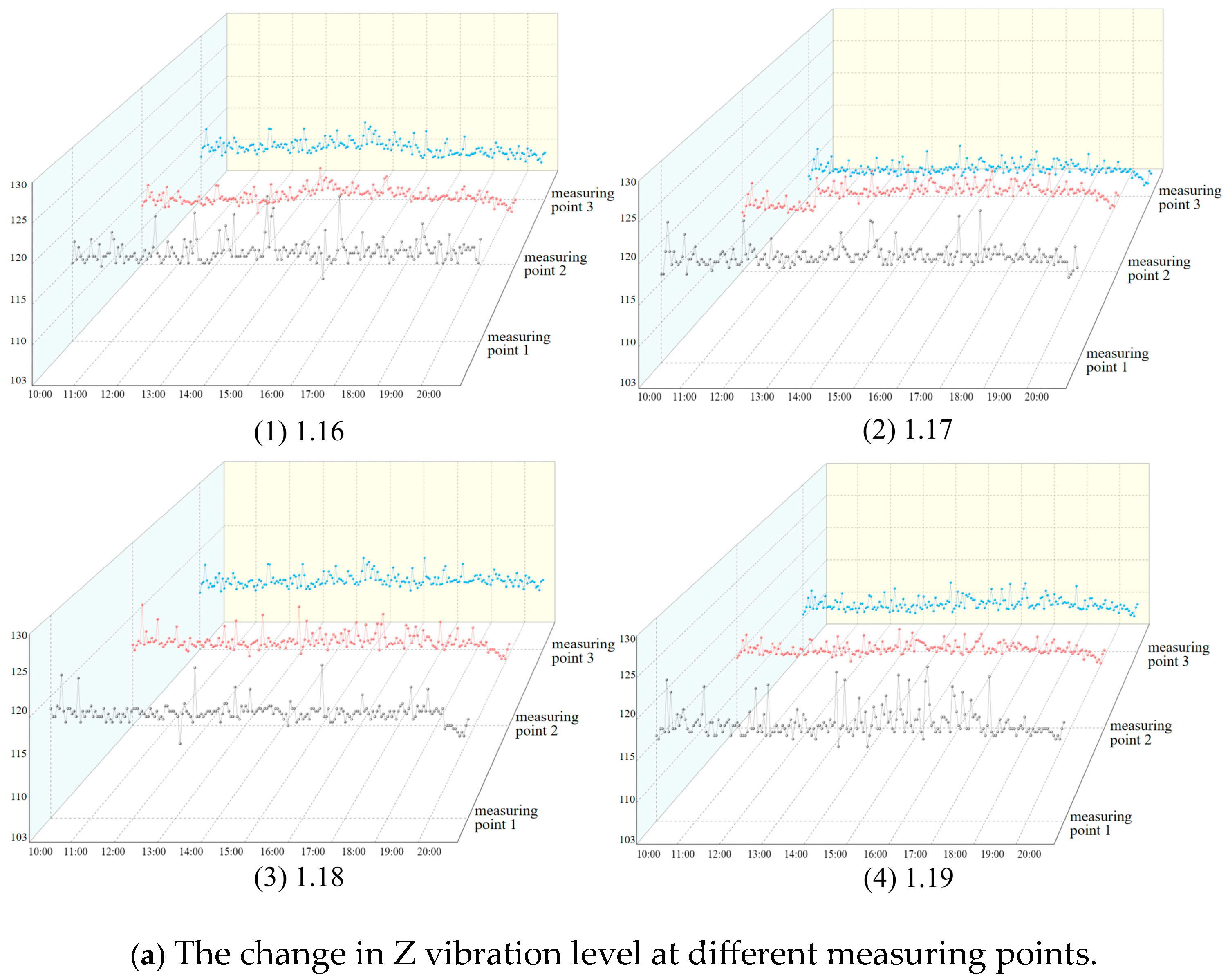 1. The thermal, acoustic and vibration environment of TOD underground space did not meet the specification limits of ISO 16813: 2024 during the winter Spring Festival. The different density and distribution of people in underground space are the decisive factors for the spatial and temporal differences in multi-physical fields in underground space. The average temperature on the rest day (17.4–18.7 °C) was higher than that on the working day (15.8–16.5 °C). The LAeq is less than 80 dB on the working day, and the LAeq on the rest day has a high intensity noise of 90–100 dB for a long time. The vibration level does not change periodically, showing the characteristics of changing with the density of personnel flow. The maximum temperature of 24.4 °C, the maximum LAeq of 108.4 dB and the maximum vibration level of 124.3 dB appeared in the peak of Sunday night.