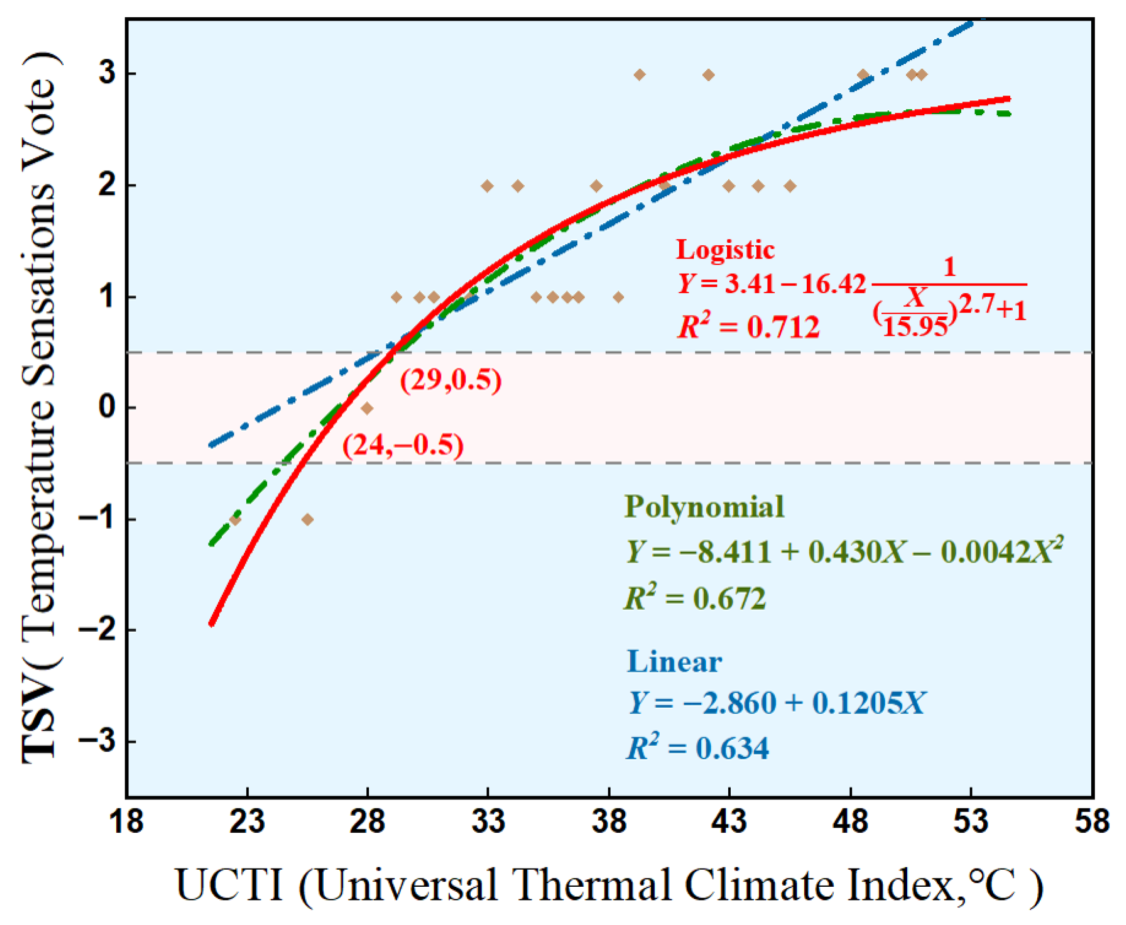 In order to predict the Thermal Sensation Voting (TSV) in the extreme operation mode of TOD underground space in winter, linear, quadratic polynomial and Logistic fitting analysis are carried out with UCTI as the dependent variable, as shown in