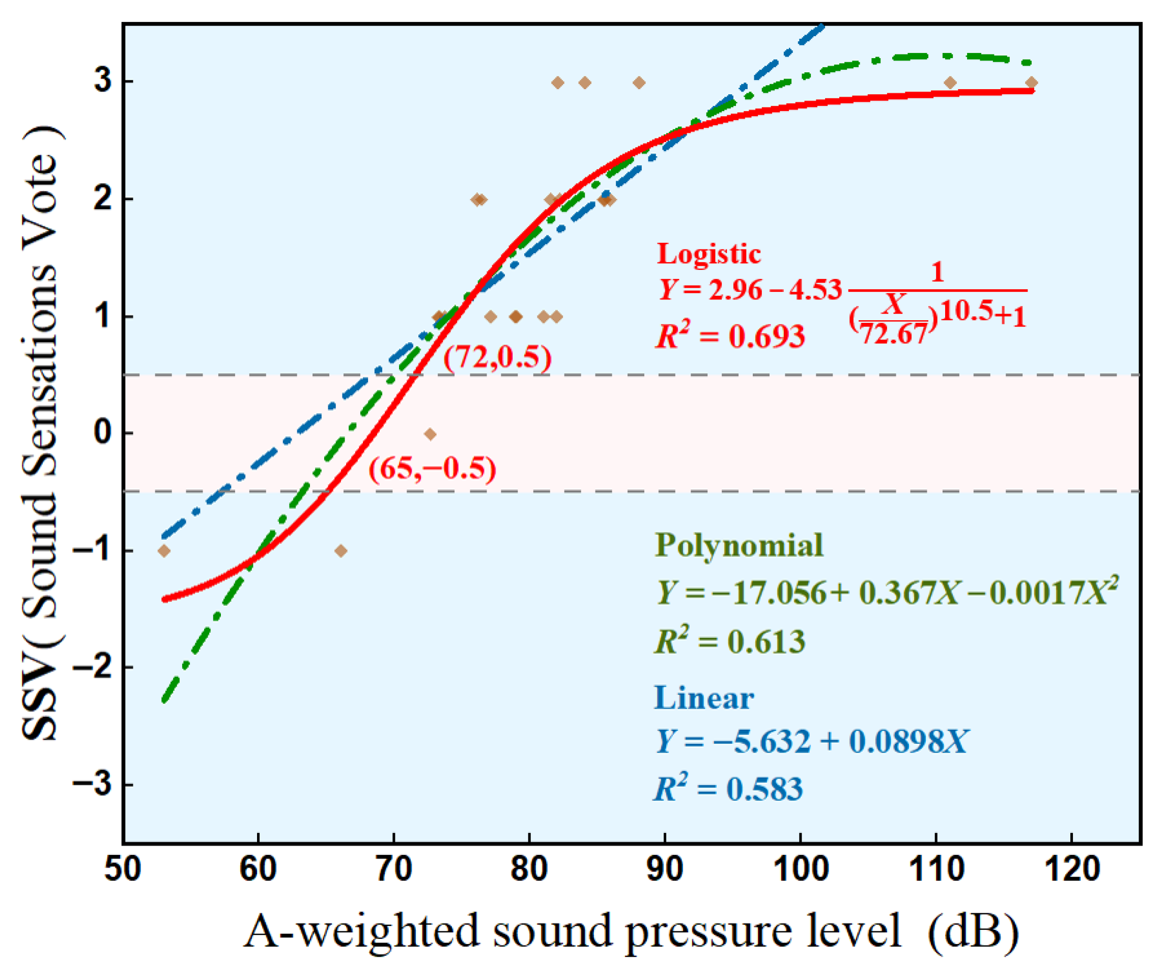 In the process of establishing the ASV evaluation model, the R2 of the Logistic regression model is 0.693, and the goodness of fit is the highest. The curve shape is highly consistent with the actual trend of ‘rapid change first and then saturation’, which can most accurately describe the nonlinear law of ASV from ‘quiet’ to ‘moderate’ and then to ‘noisy’. The linear regression has the lowest goodness of fit, which can only reflect the overall trend of ASV rising with the increase in acoustic pressure level, and cannot reflect the nonlinear characteristics.