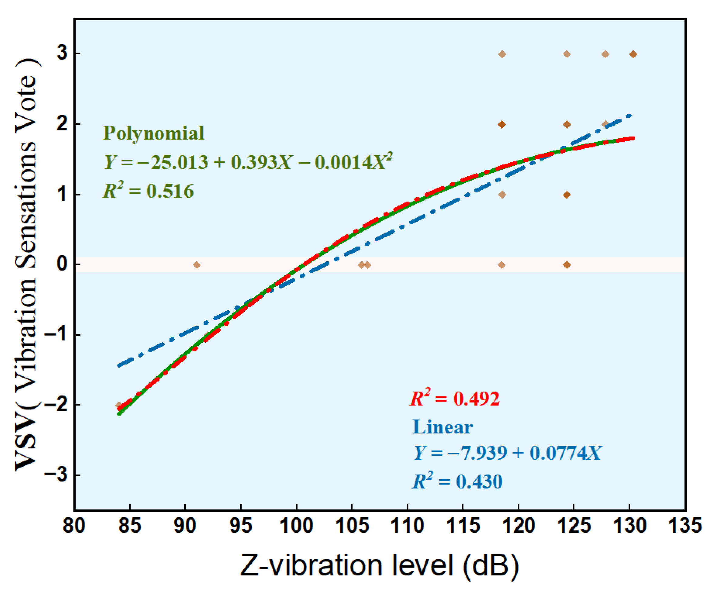Figure 10 is the fitting result of the corresponding vibration sense voting value. From the scatter distribution and fitting curve, it can be seen that the Vibration Sensation Voting (VSV) is nonlinearly correlated with the Z-direction vibration level. When the vibration level is at a low level (80–96 dB), the VSV is mostly negative, reflecting that the vibration intensity Sensation is not obvious. As the vibration level rises to the range of (96–120 dB), the VSV quickly changes from negative to positive, indicating that the increase in vibration level makes the subjective feeling change from ‘light vibration feeling’ to ‘strong vibration feeling’. When the vibration level exceeds 120 dB, the growth of VSV slows down, which means that when the vibration intensity continues to rise, the vibration level is unbearable.