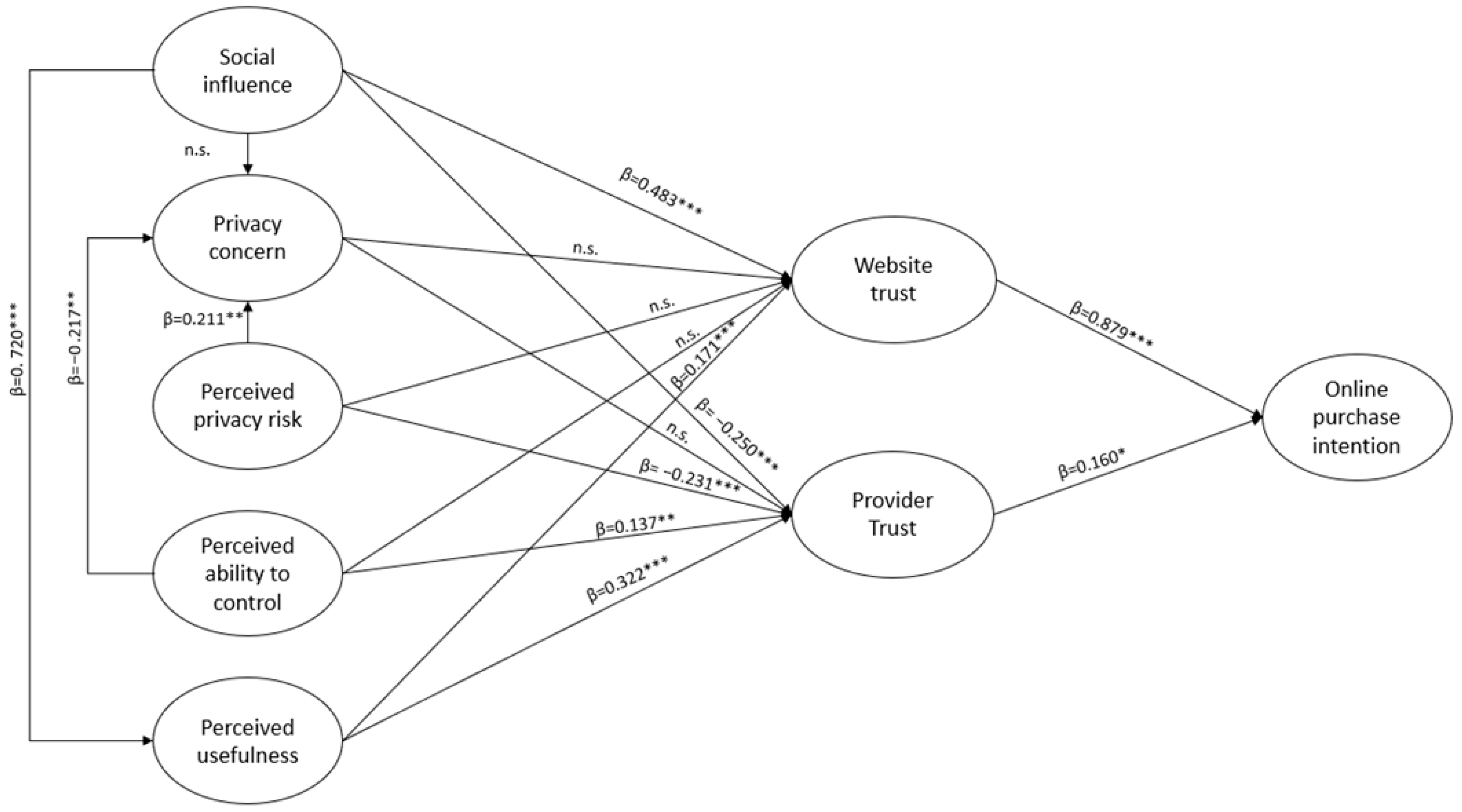 a The items listed in this table have been summarised for ease of presentation and comprehension. b SD: standard deviation; c α: Cronbachs alpha β: standard regression weight; α reliability (Cronbach’s alpha); CR: composite reliability; AV: average variance. The scales used have been adapted from the literature. The following references describe the main concepts in our study and the most significant aspects: social influence [100]; privacy concern [101]; perceived privacy risk [102]; perceived ability to control [5]; perceived usefulness [103]; website trust [5,104]; provider trust [5,105]; and online purchase intention [6].
