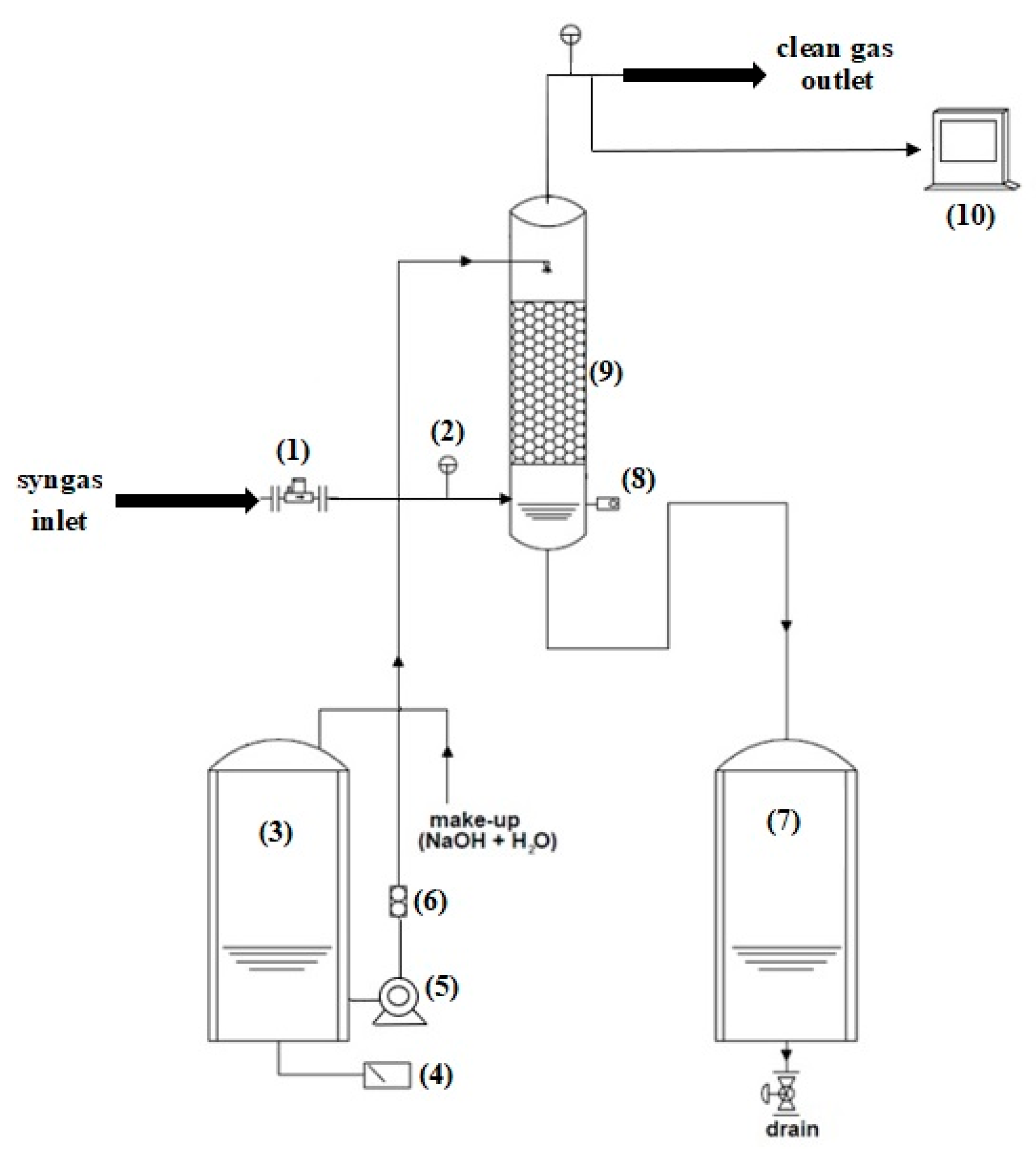 An alkaline washing solution was sprayed counter-currently from the top of the column using a circulation pump. The liquid flow rate was adjusted to maintain the desired liquid-to-gas (L/G) ratio and monitored in real-time using a liquid flow meter. To avoid flooding of the column, the solution level was maintained via level transmitters installed within the column.