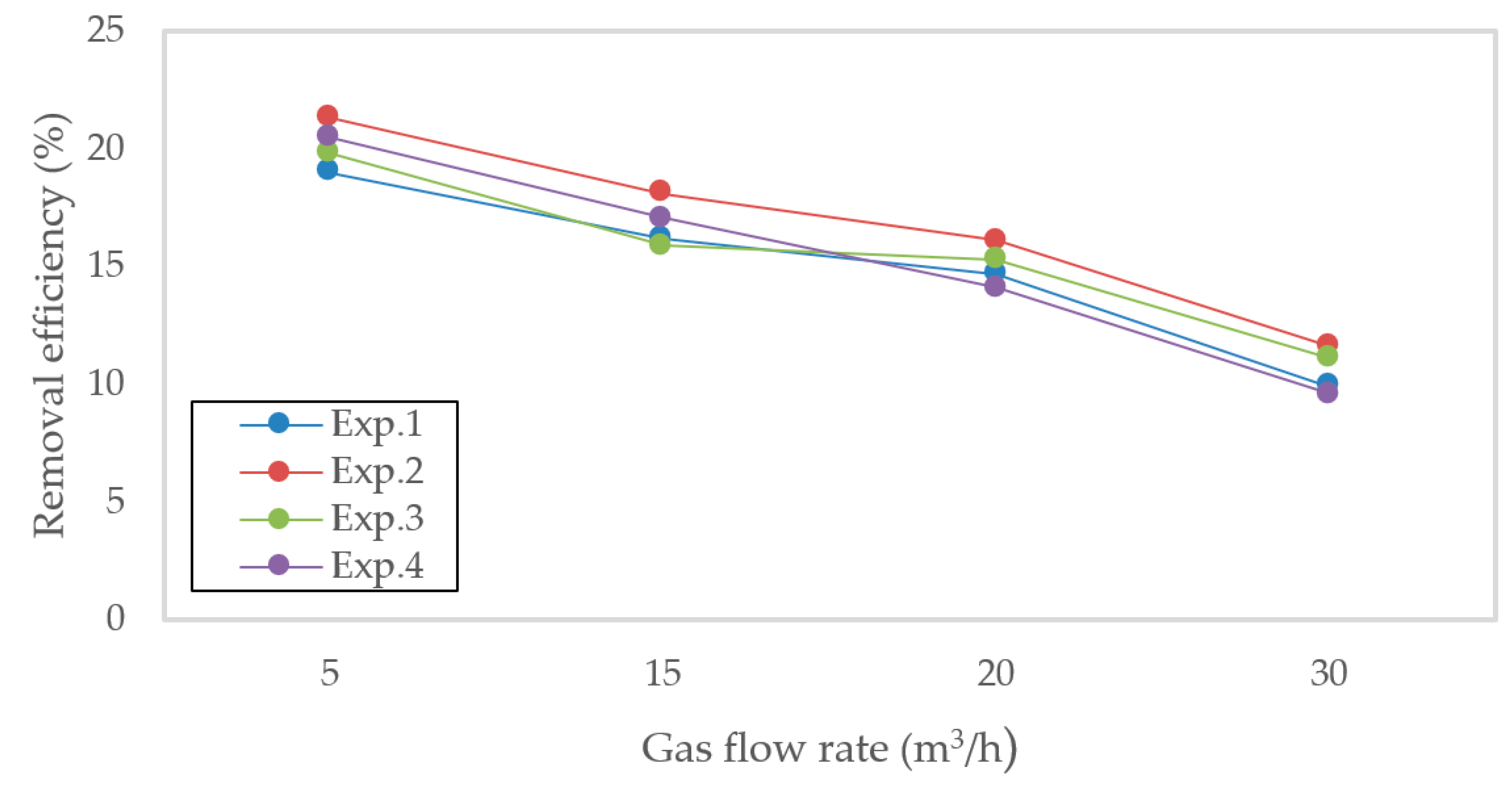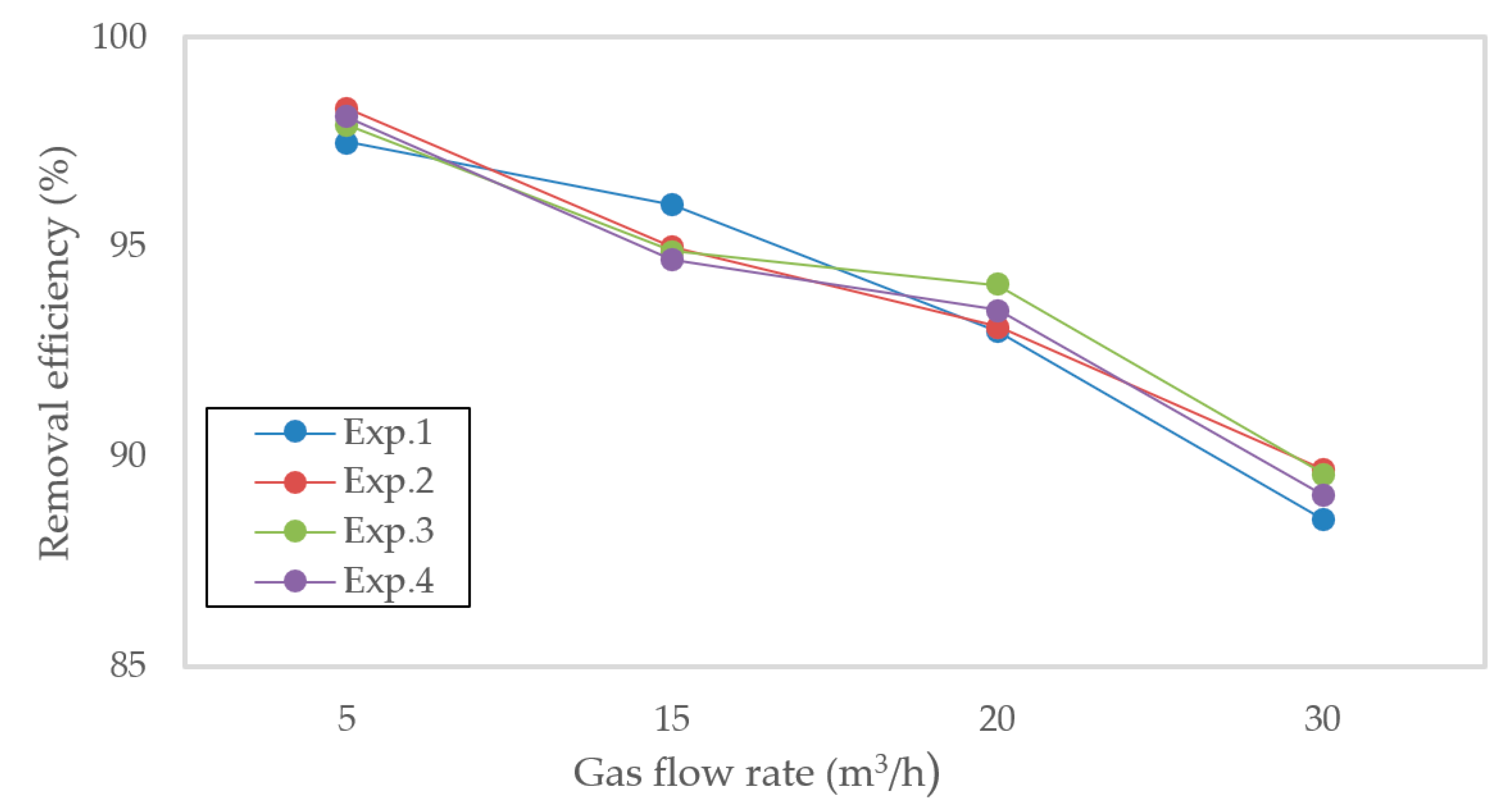 Figure 2. H2S removal efficiency (%) from experiments Exp.1–Exp.4 in a 10 cm structured-packing column at gas flow rates of 5, 15, 20, and 30 m3/h. Efficiency >85% across all rates due to excellent gas–liquid contact and fast NaOH reaction.