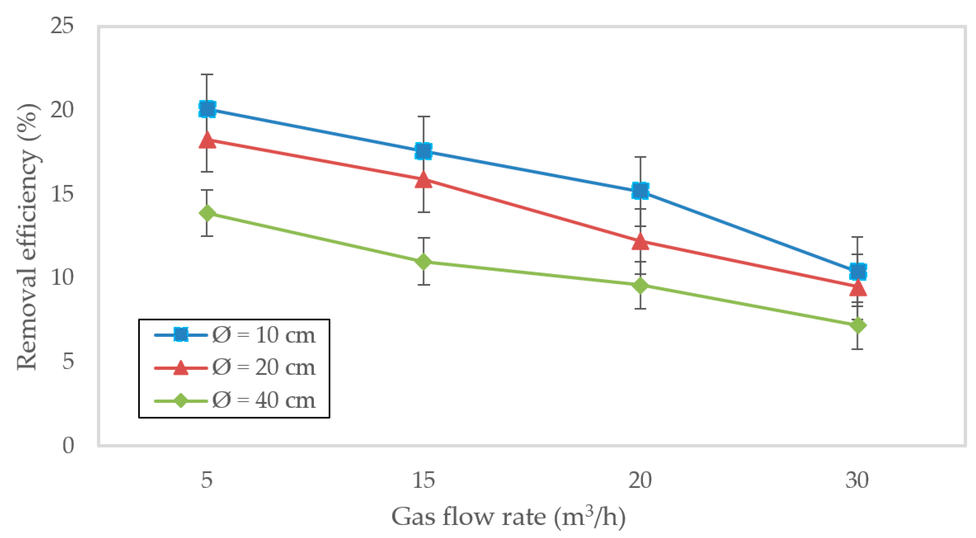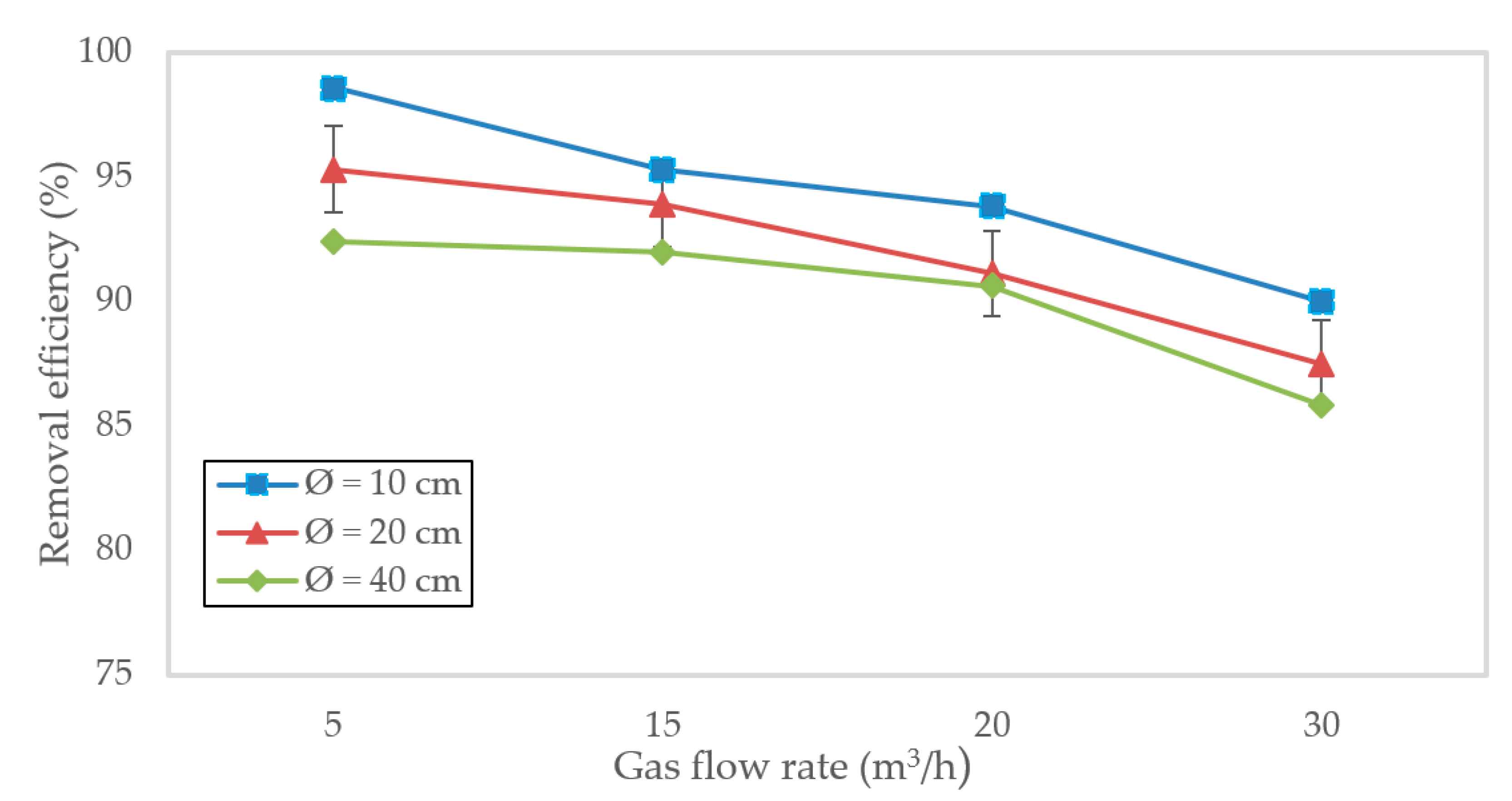 Figure 6. Simulated CO2 removal efficiency (%) vs. gas flow rate (5–30 m3/h) in structured-packing columns of varying diameters. Lines agree closely with 10 cm experiments (Figure 5); efficiency drops in larger columns due to reduced residence time and interfacial area. Error bars indicate ±4% uncertainty derived from four replicate experimental measurements.