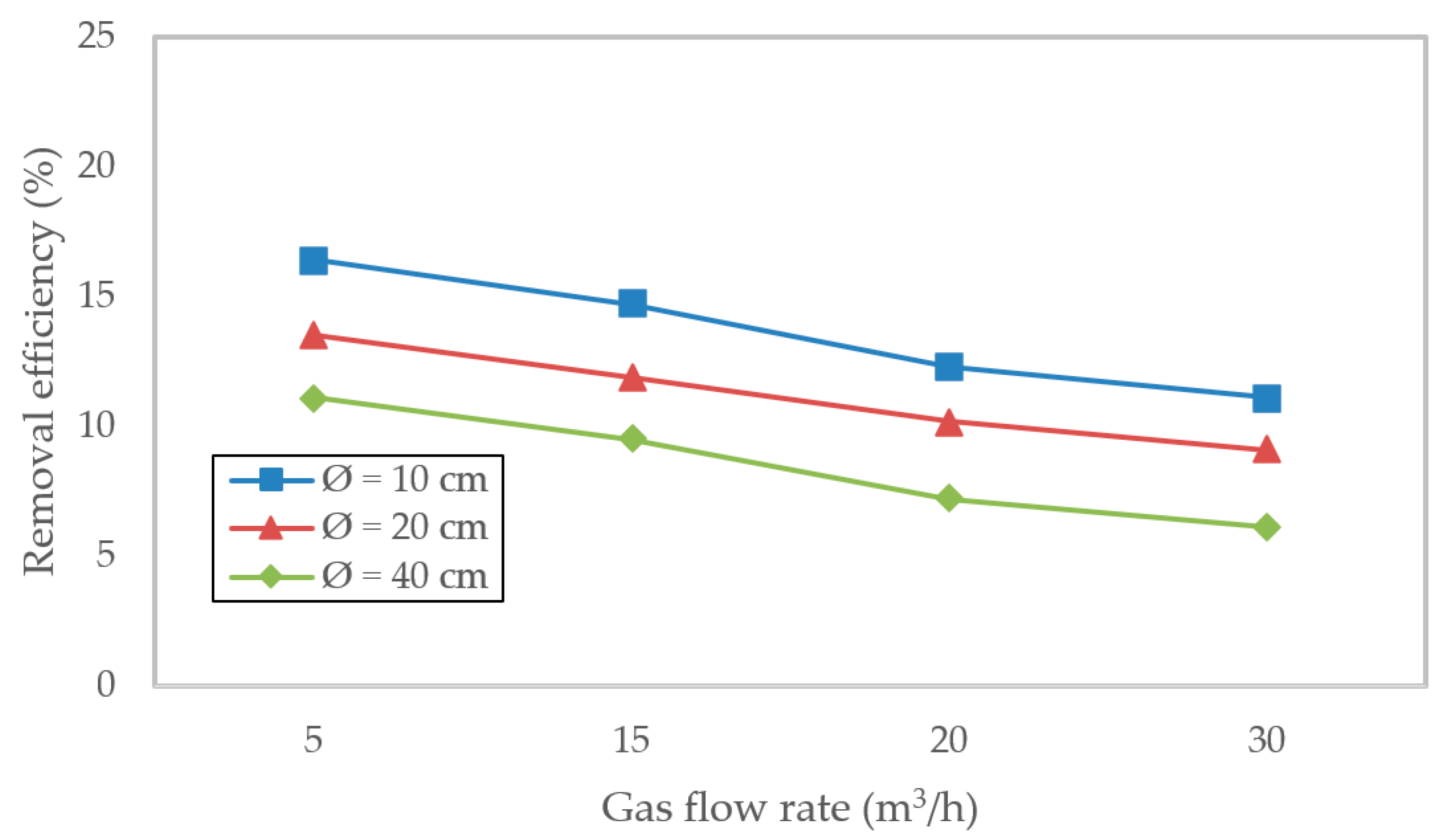 Figure 4. Simulated H2S removal efficiency (%) versus gas flow rate (5–30 m3/h) in absorption columns of 10, 20, and 40 cm diameter using random packing. Removal efficiencies are lower than those for structured packing, dropping below 80% at 30 m3/h in the 40 cm column, due to flow channeling and reduced effective interfacial area.