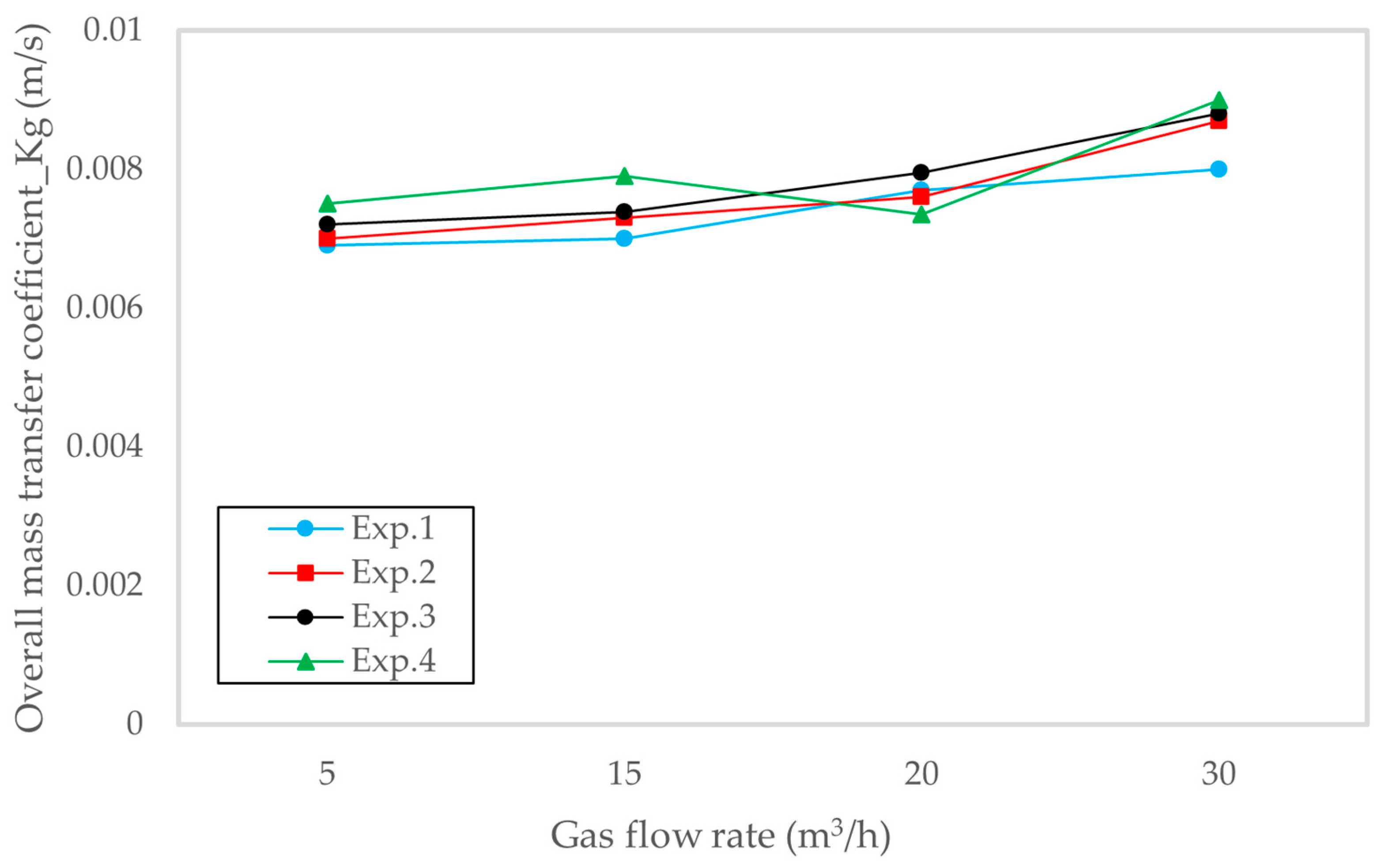Figure 8. Overall gas-phase mass transfer coefficient Kg (m/s) vs. gas flow rate (5–30 m3/h) values within a 10 cm structured-packing column experiments. Kg rises with flow.