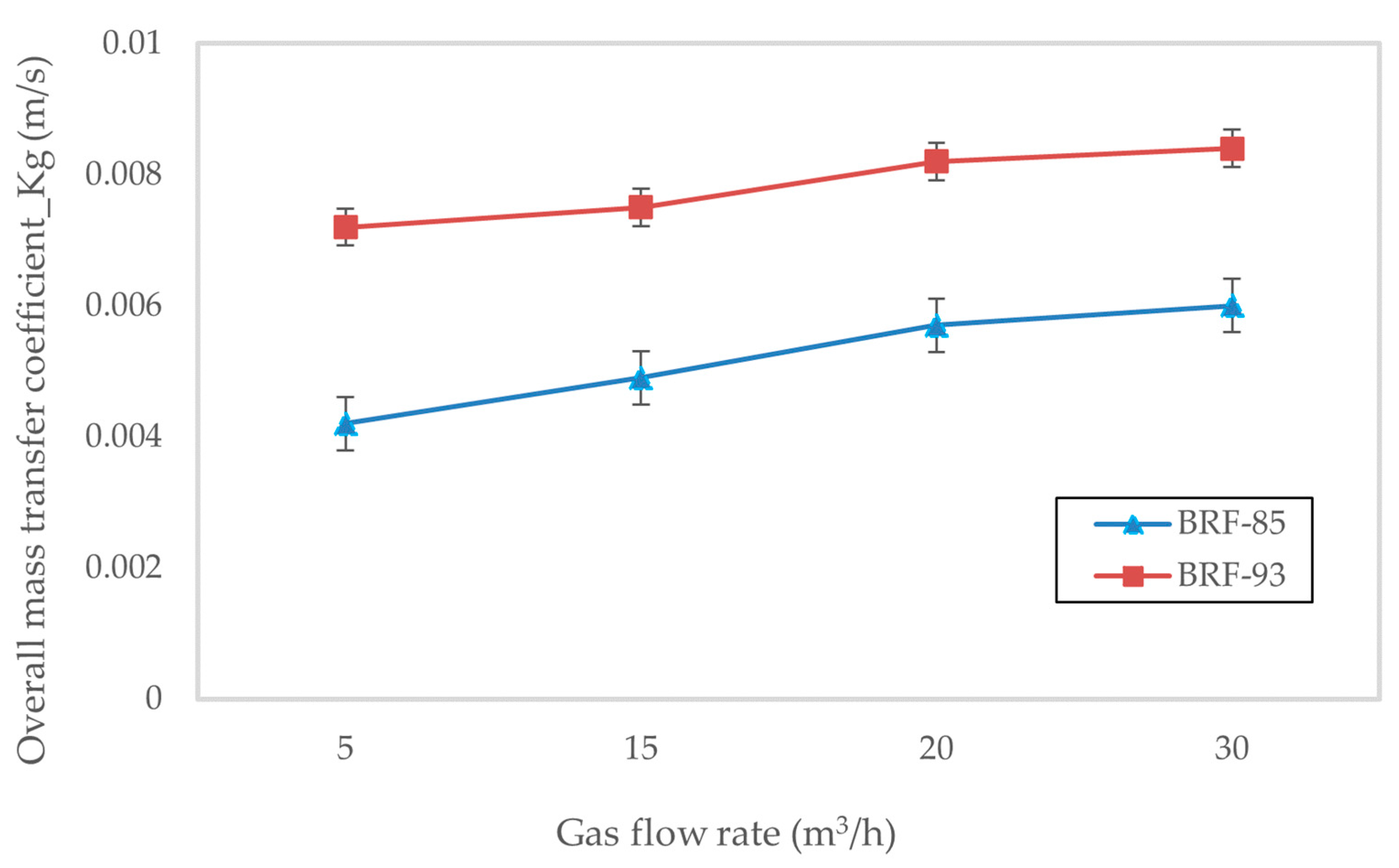Figure 9. Overall gas-phase mass transfer coefficient, Kg (m/s), as a function of gas flow rate (5–30 m3/h) in a 10 cm diameter column with structured packing. The BRF-93 model shows excellent agreement with experiments and predicts a moderate increase in Kg with flow rate due to enhanced interfacial turbulence. Error bars indicate ±4% uncertainty derived from four replicate experimental measurements.