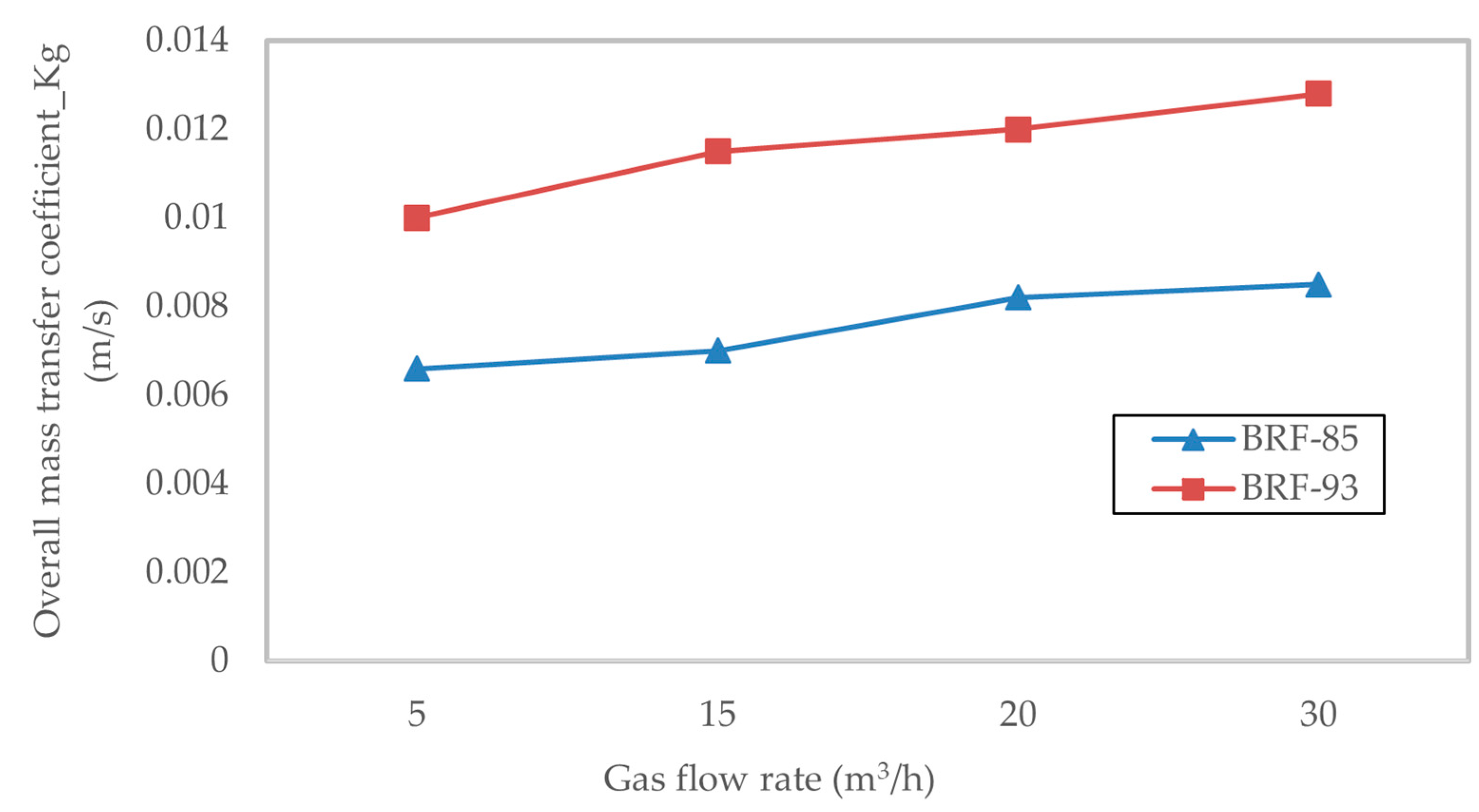 Figure 10. Overall gas-phase mass transfer coefficient, Kg (m/s), versus gas flow rate (5–30 m3/h) in a 10 cm diameter column using random packing. Predictions from BRF-85 and BRF-93 models are shown (lines). Random packing yields higher Kg values than structured packing across all flow rates, driven by greater surface wetting and localized turbulence, despite lower geometric surface area.