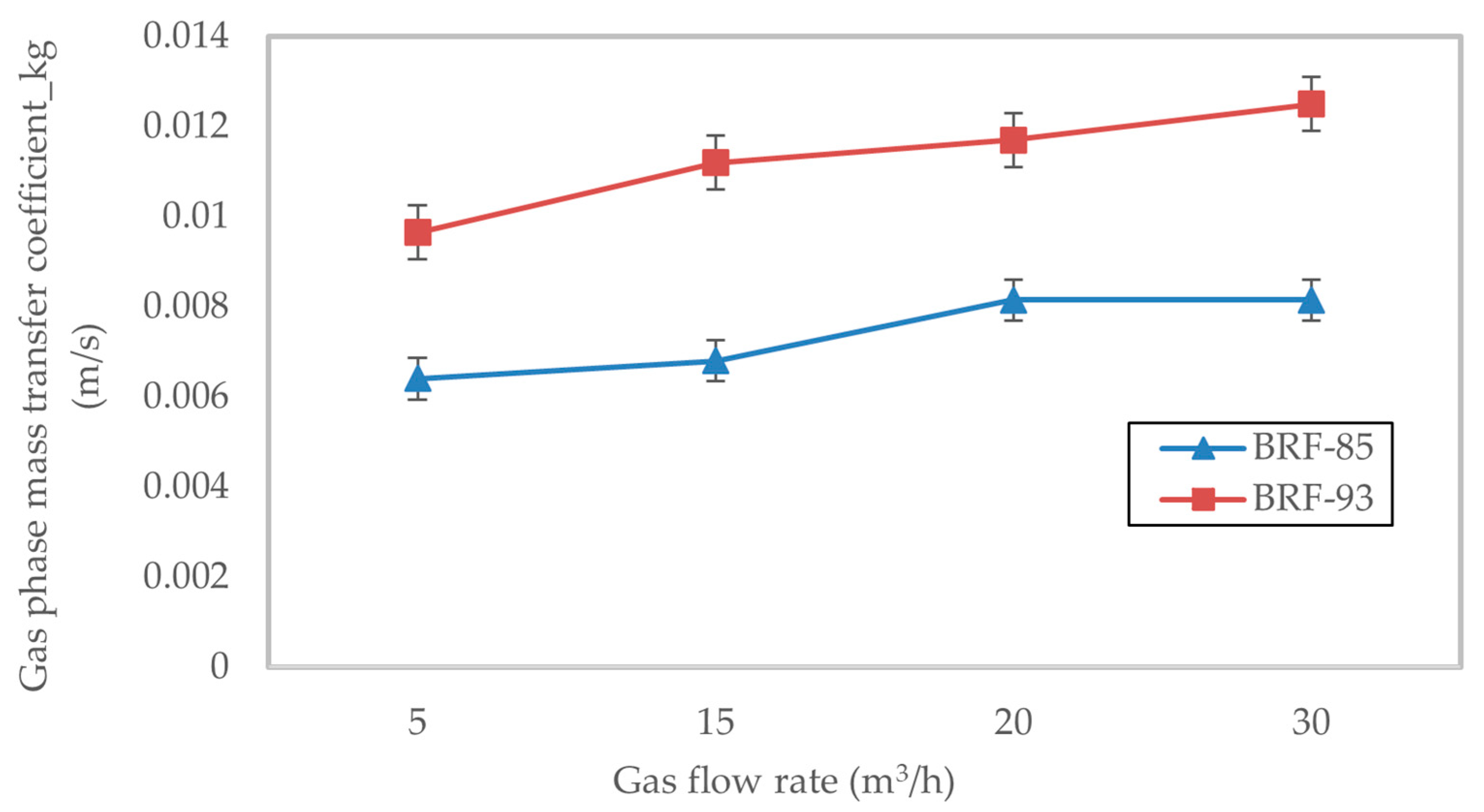 Figure 11. Gas phase film coefficient, kg (m/s), as a function of gas flow rate (5–30 m3/h) in a 10 cm diameter column with structured packing. BRF-85 and BRF-93 model predictions (lines) indicate a gradual increase in kg with flow rate, reflecting reduced boundary layer resistance. The BRF-93 model provides more accurate predictions, particularly at higher velocities.