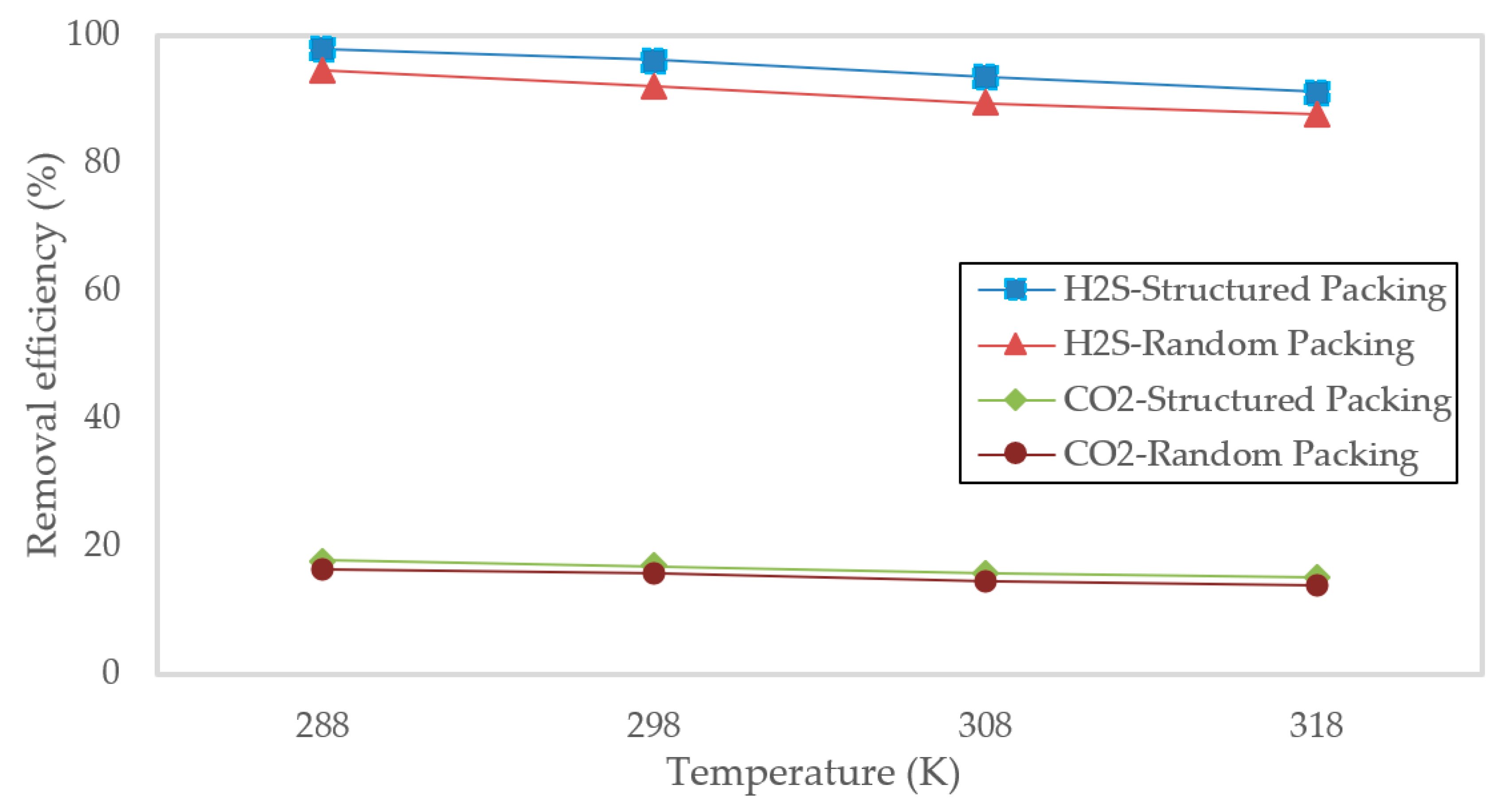 Figure 13. Effect of temperature (288–318 K) on H2S and CO2 removal (%) in 10 cm columns (structured/random packing) at 15 m3/h and 1.0 wt% NaOH. H2S drops 97.8 to 91.2% (structured) and 94.5 to 87.6% (random) due to exothermic reaction (ΔH ≈ −70 kJ/mol); CO2 falls only 2–3%.