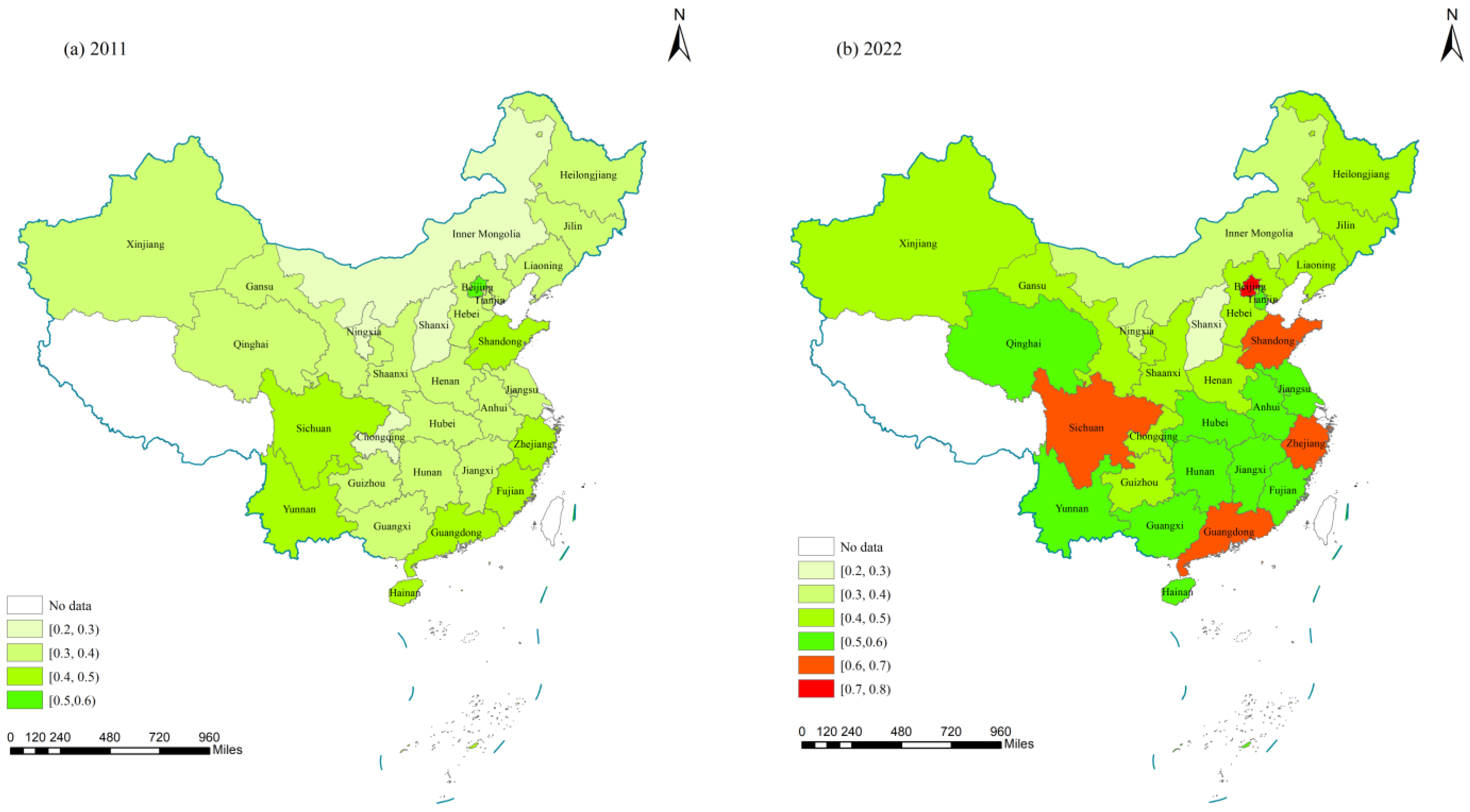 Figure 2 illustrates the changes in the provincial distribution of China’s RIGG index between 2011 (a) and 2022 (b). In 2011, eight provinces recorded a RIGG index exceeding 0.4, thereby entering the transition zone. Among these, Beijing was the only region classified at the almost coordination level, while the other seven provinces remained in the almost imbalance category. The remaining 21 provinces fell within the unacceptable range. By 2022, a notable improvement was observed in the spatial pattern of RIGG. The number of provinces in the unacceptable range dropped to three, while 21 provinces advanced to the transition zone, and five provinces reached the acceptable range. Beijing progressed further to the intermediate coordination level.