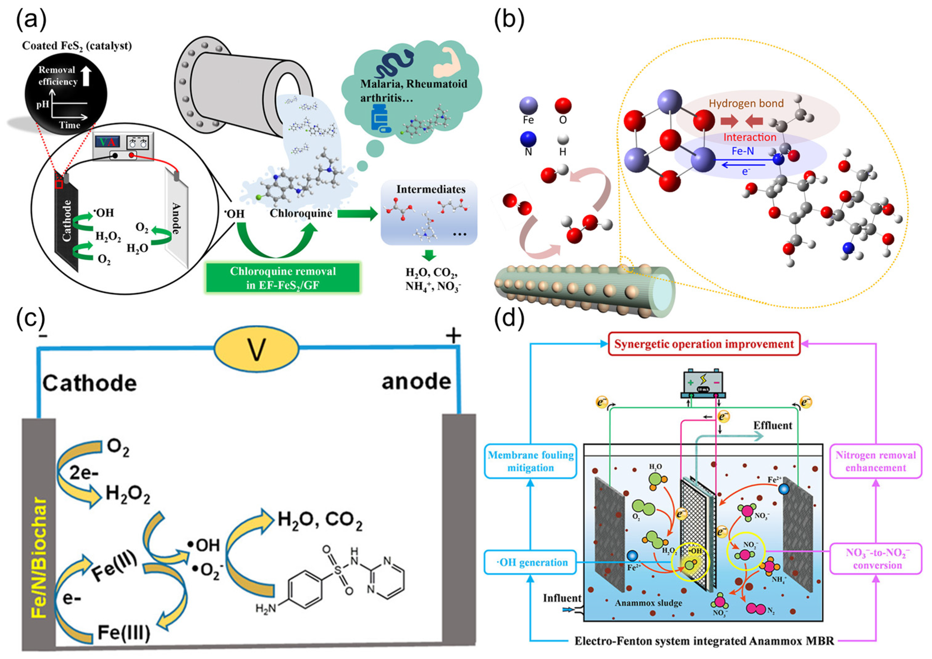 Figure 3. Mechanism of heterogeneous catalysts in the EF process: (a) FeS2/GF catalyst. Reprinted with permission from Ref. [68]. Copyright 2023 American Chemical Society. (b) tuning Fe3O4 by acetylated chitosan. Reprinted from Ref. [70]. (c) Fe/N/Biochar catalyst. Reprinted with permission from Ref. [71]. Copyright 2020 American Chemical Society. (d) Fe-MOFs catalyst. Reprinted with permission from Ref. [72]. Copyright 2025 American Chemical Society.
