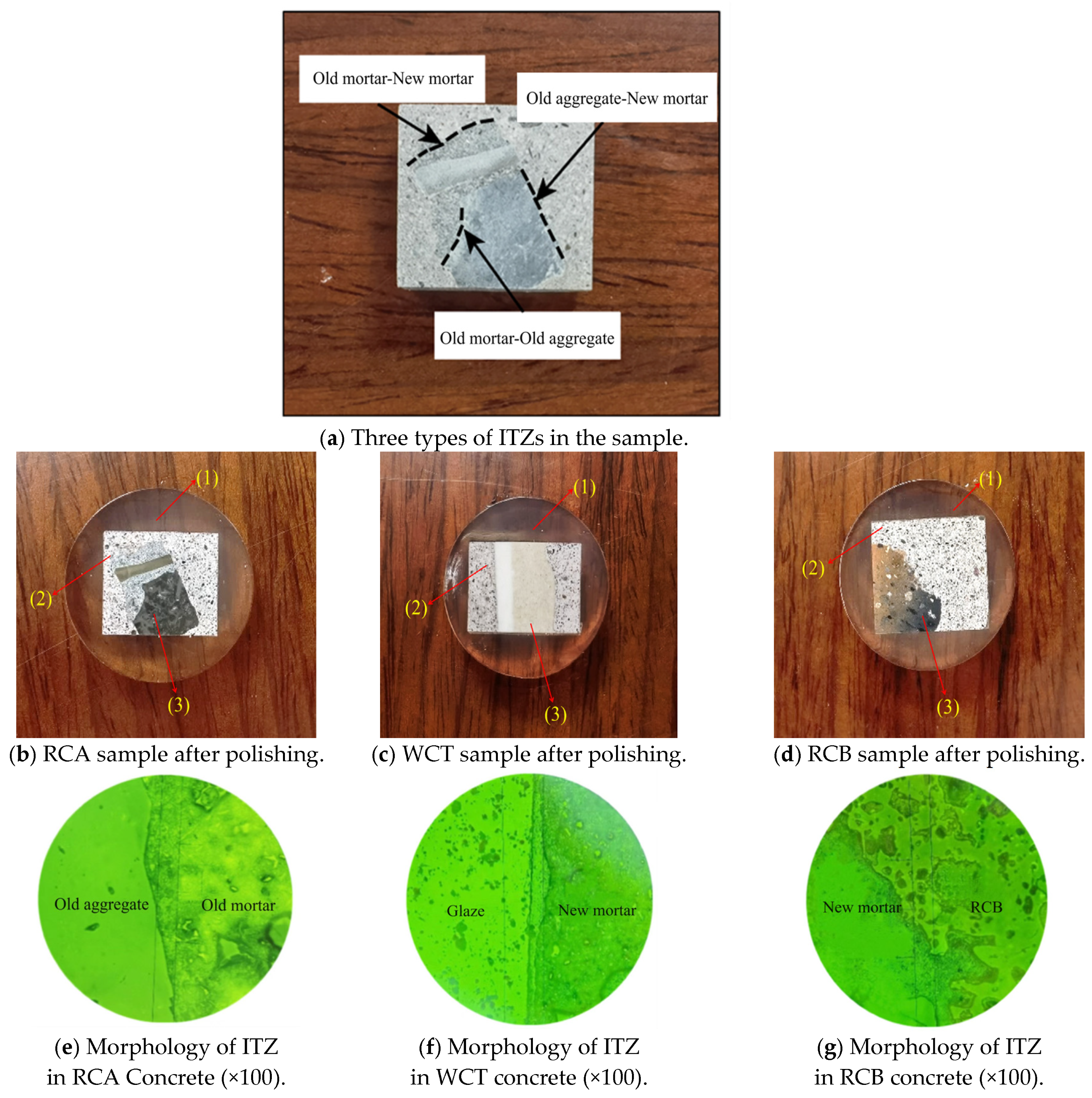 - Liu, J.; Ma, K.; Shen, J.; Zhu, J.; Long, G.; Xie, Y.; Liu, B. Influence of Recycled Concrete Aggregate Enhancement Methods on the Change of Microstructure of ITZs in Recycled Aggregate Concrete. Constr. Build. Mater. 2023, 371, 130772. [Google Scholar] [CrossRef]