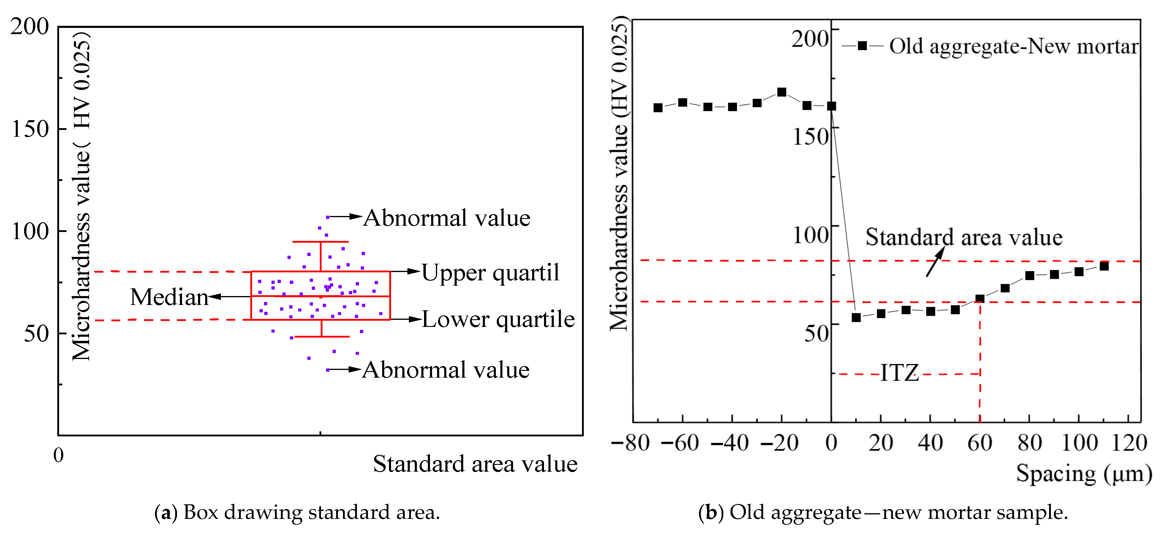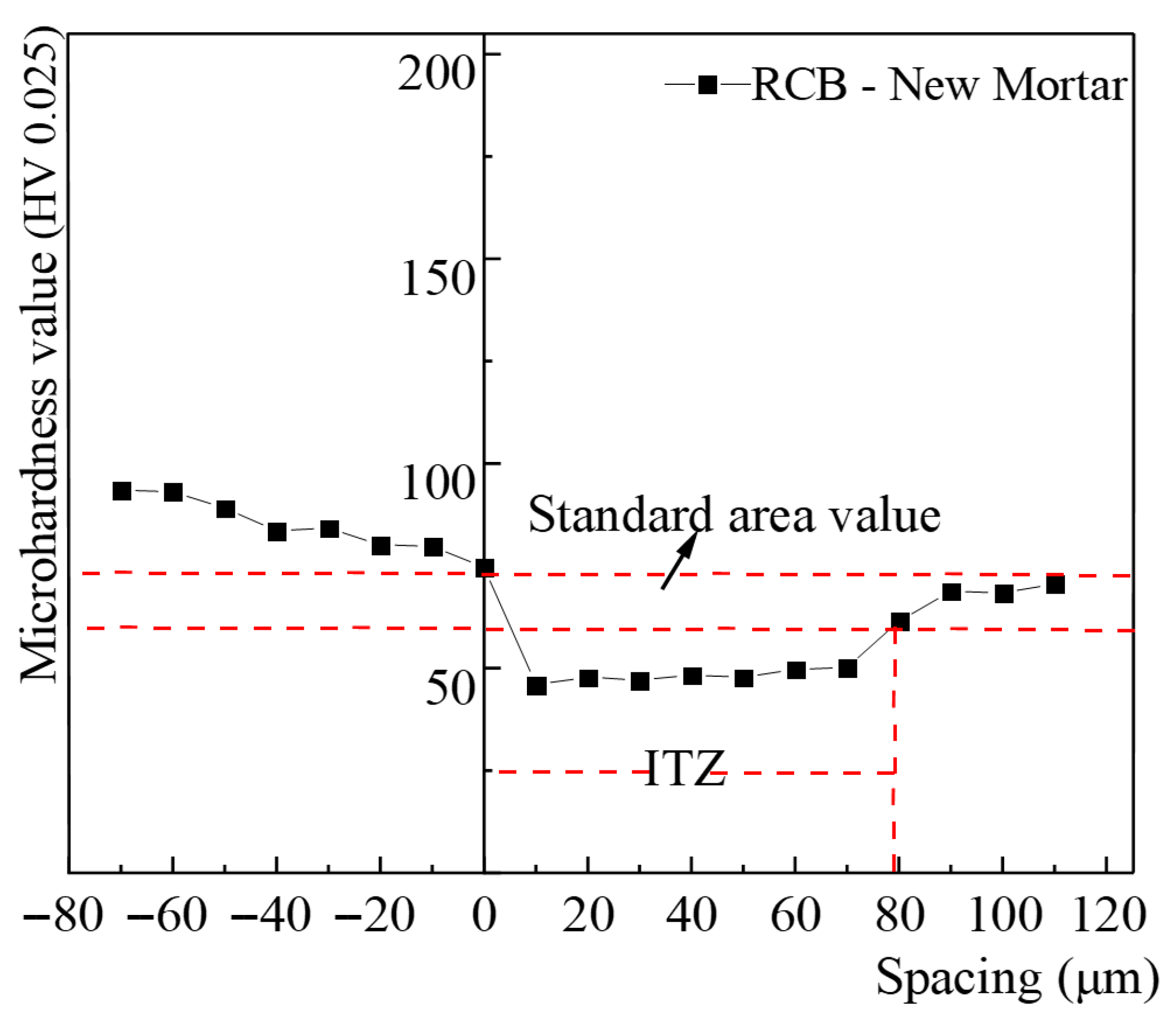 3.4.3. Microhardness of the ITZ of RCB Recycled Aggregate Concrete