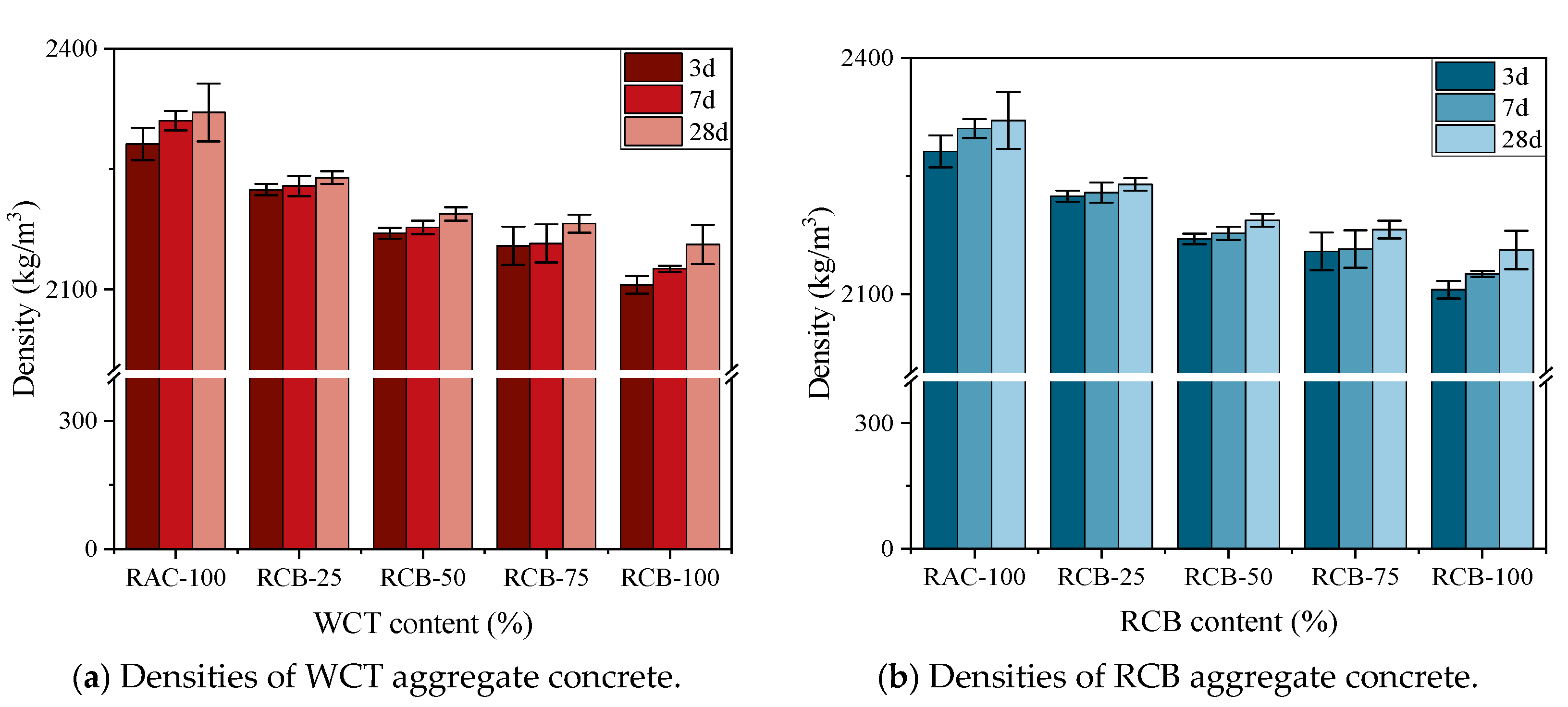 - At the macroscopic level, both apparent density and ultrasonic pulse velocity (UPV) decreased with increasing replacement rates of WCT or RCB, reflecting the influence of aggregate porosity and stiffness on the overall packing density and internal homogeneity of concrete. While the overall trend showed a decrease in density and UPV with increasing replacement, the RCB concrete exhibited a local maximum UPV at 75% replacement, indicating a non-linear relationship between replacement ratio and compactness. WCT concrete exhibited the lowest density reduction (≈5.6% at 100% substitution), while RCB concrete showed the largest (≈7%), owing to its higher water absorption and microstructural heterogeneity. These trends indicate that the internal continuity and compactness of the composite skeleton are governed not only by the intrinsic aggregate density but also by the degree of hydration achieved at the interfacial zones.