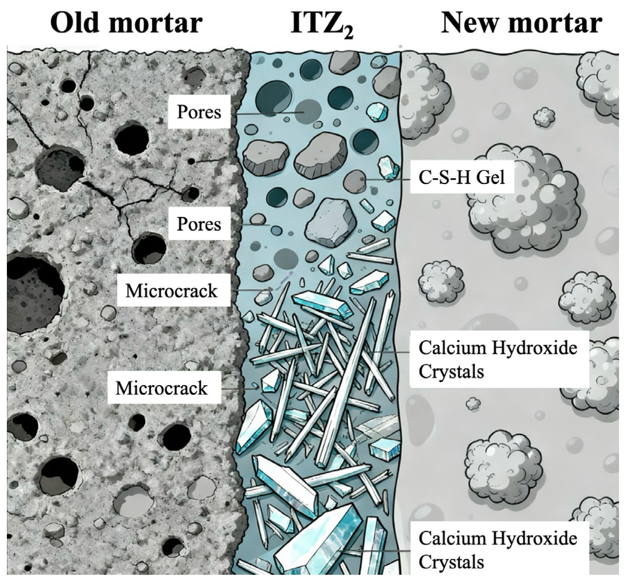 - Comparative analysis of the three ITZ types—old aggregate–old mortar, old mortar–new mortar, and old aggregate–new mortar—further revealed that the weakest bonding occurred at the old–new mortar interface (ITZ2), primarily due to incomplete hydration and water redistribution during mixing. The old aggregate–new mortar interface (ITZ3) benefited from a wall effect that promoted localized precipitation of calcium hydroxide and ettringite, leading to slightly higher hardness and improved bonding. These observations indicate that optimizing interfacial compatibility between recycled and new phases is critical for enhancing mechanical stability.