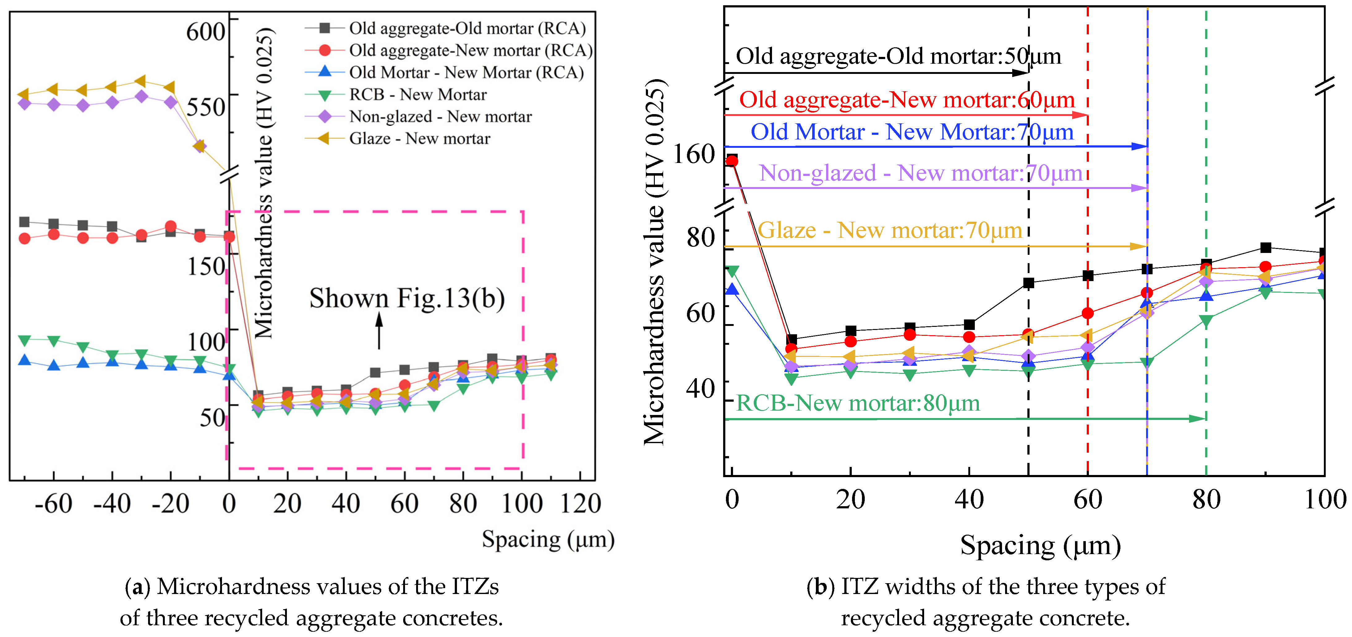 - RCA concrete showed moderate microhardness and a multi-layered ITZ structure, reflecting the coexistence of old and new cementitious phases. The relatively denser ITZ3 explains the superior compressive performance of RCA concrete.