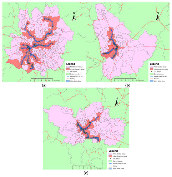 As shown in Figure 2, The key treatment indicator is whether the area has been served by a newly opened light rail station. A 500-m buffer was created around each station opened during the period of interest, a distance commonly used to define the area of influence [62]. MSOAs that exhibited substantial spatial overlaps with the 500-m buffer were classified as the treatment group, while MSOAs entirely located outside the buffer were defined as the control group. This classification ensures spatial proximity and socioeconomic comparability between treatment and control areas.