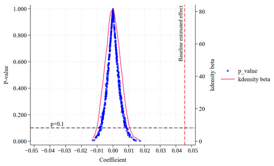 Finally, following the approach of Z. Wang et al. (2022) [71] and Dagestani et al. (2023) [72], a placebo test is conducted to further examine whether the observed effects may be driven by random factors or unobserved variables. The core idea of the placebo test is to construct pseudo-treatment groups and conduct repeated simulations to assess whether the estimated effects arise from the actual intervention rather than from random variation or other systematic influences.