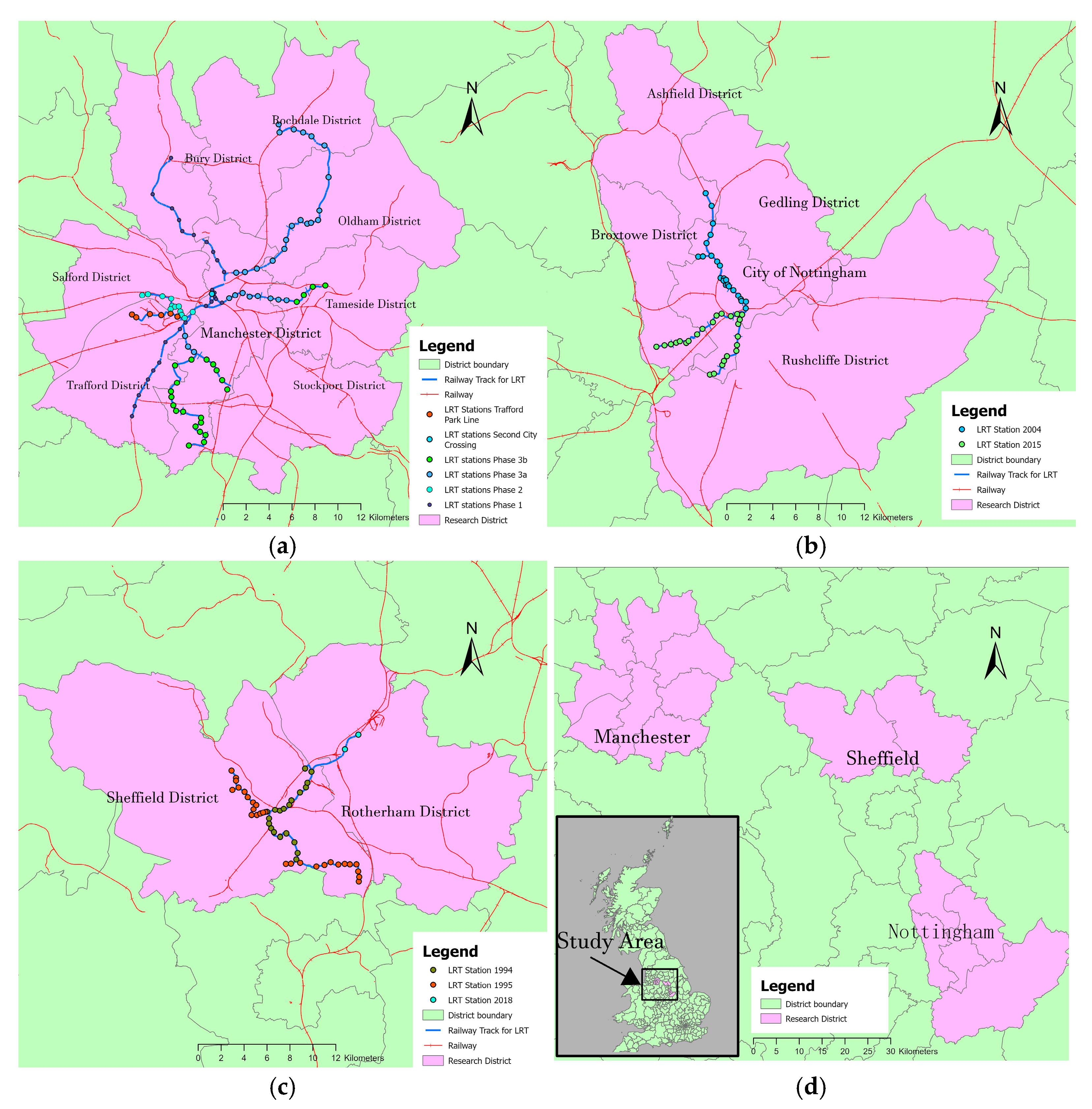To verify whether LRT systems still possess such transformative potential in mature urban areas and to address the temporal and spatial limitations of previous studies, this research adopts a comparative multi-city approach to assess how light rail development influences property values. The UK offers an ideal empirical context, with consistent institutional frameworks and available data on transport and property values. This study selects three representative cities, Manchester, Sheffield, and Nottingham, that have new or extended LRT systems in recent years. These cities not only share common experience with light rail development, but also exhibit diverse policy settings, spatial configurations, and planning strategies so that can make them fit for comparative analysis of heterogeneous LRT impacts.