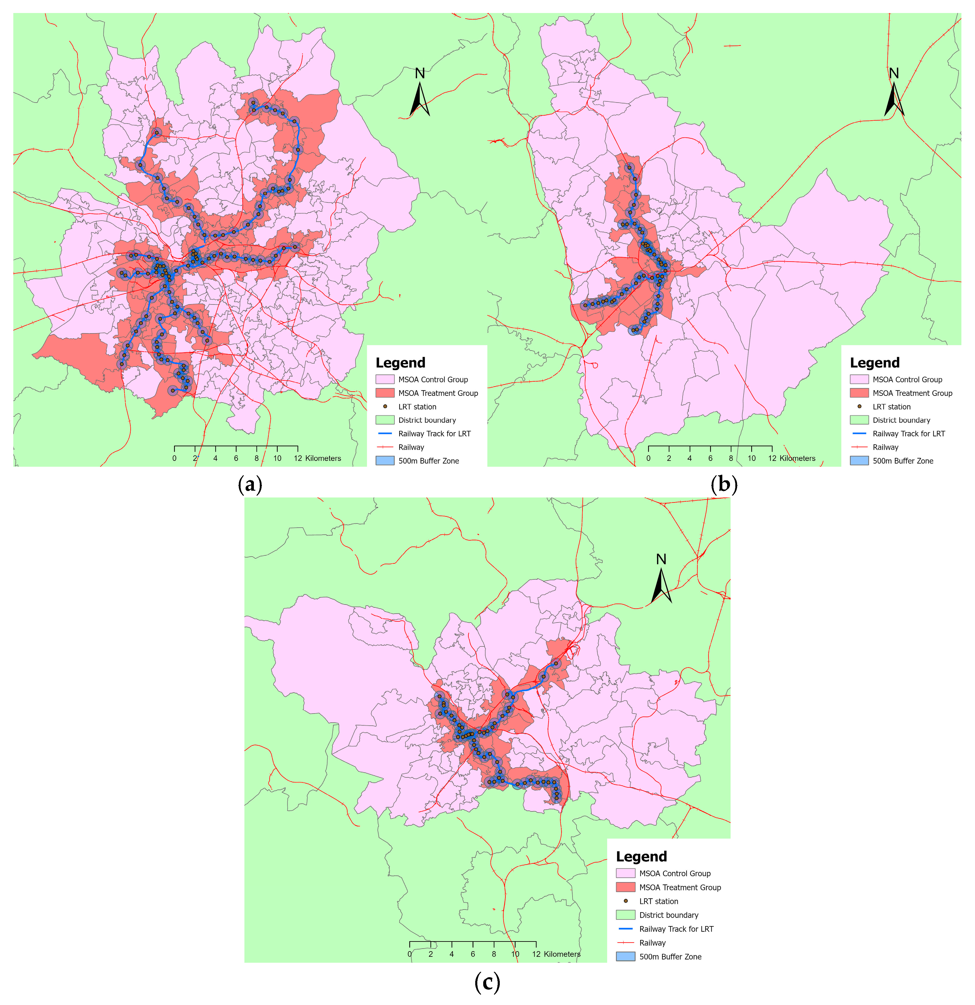27]. Analyses of newer or extended LRT systems in other regions have received little attention. By evaluating multiple cities with post-1995 LRT investments, this study offers systematic evidence on long-term property value impacts and reveals heterogeneous outcomes across urban contexts. The findings also provide empirical insights for policymakers how transit investments influence property markets and reflect spatial and economic transformations across diverse urban environments.