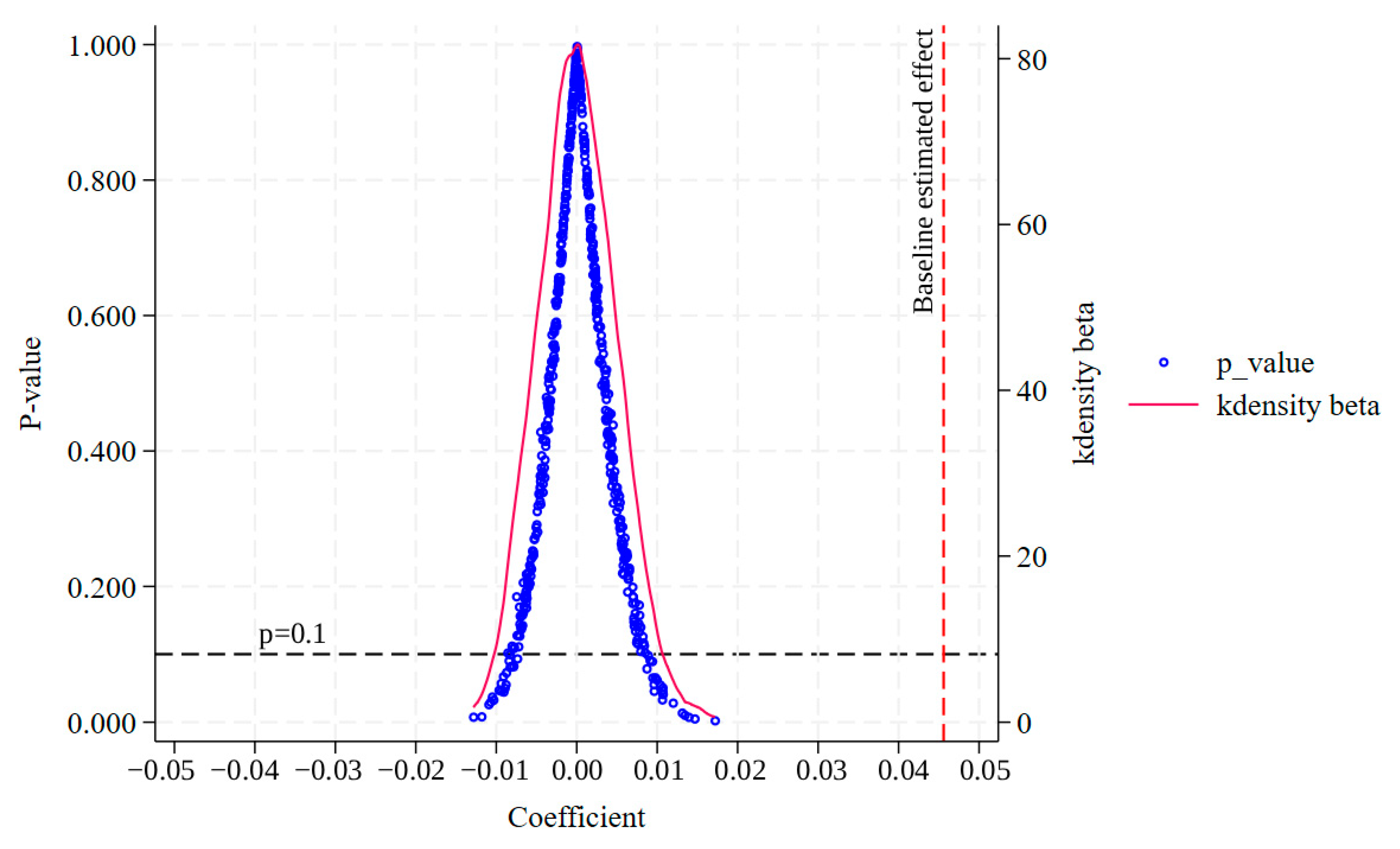 72], a placebo test is conducted to further examine whether the observed effects may be driven by random factors or unobserved variables. The core idea of the placebo test is to construct pseudo-treatment groups and conduct repeated simulations to assess whether the estimated effects arise from the actual intervention rather than from random variation or other systematic influences.