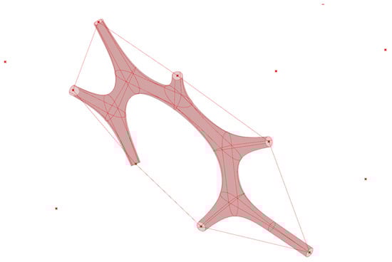 Once the relaxed skeleton is obtained, a continuous surface envelope is generated around it, resulting in a smooth minimal-surface-like geometry that connects all anchor points and produces a coherent spatial structure (Figure 4). This workflow aligns with principles of generative design applied to minimal surfaces in parametric modeling, as demonstrated by Gökmen (2022), who explored algorithmic approaches to develop minimal-surface-based tectonics [54].