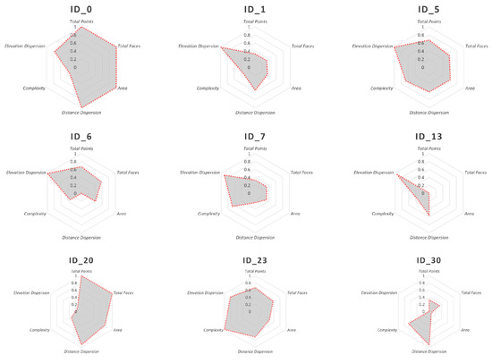 Comparative graphical representation of the attributes for each sculpture. The attribute values were normalized to a 0–1 scale.
