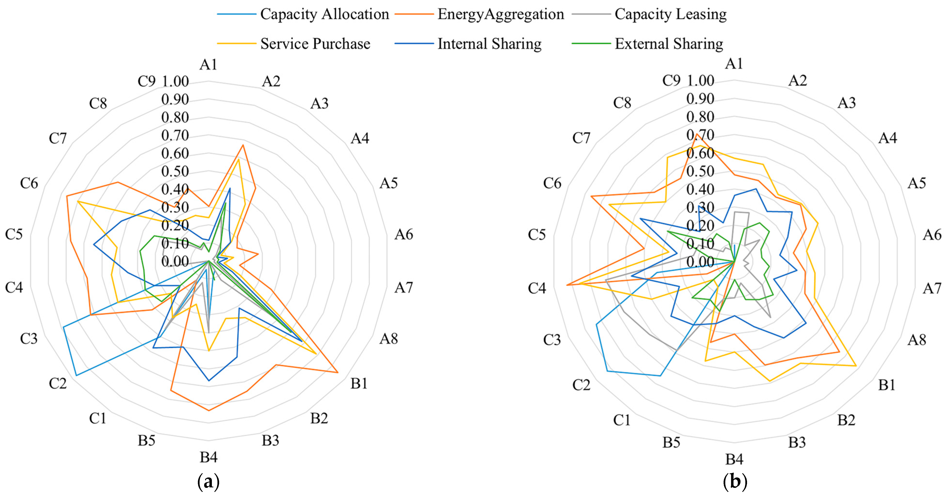 In the production scenario, the index with the highest subjective weight is A3, with a weight of 0.0844, highlighting experts’ preference for replacing traditional energy sources in agricultural production. The index with the highest objective weight is C9, with a weight of 0.0697, reflecting the objective value in deferring grid investments. The index with the highest combined weight is C7, with a weight of 0.0667, indicating that the traditional peak and valley arbitrage benefit remains the most dominant requirement after Nash negotiation coordination.
