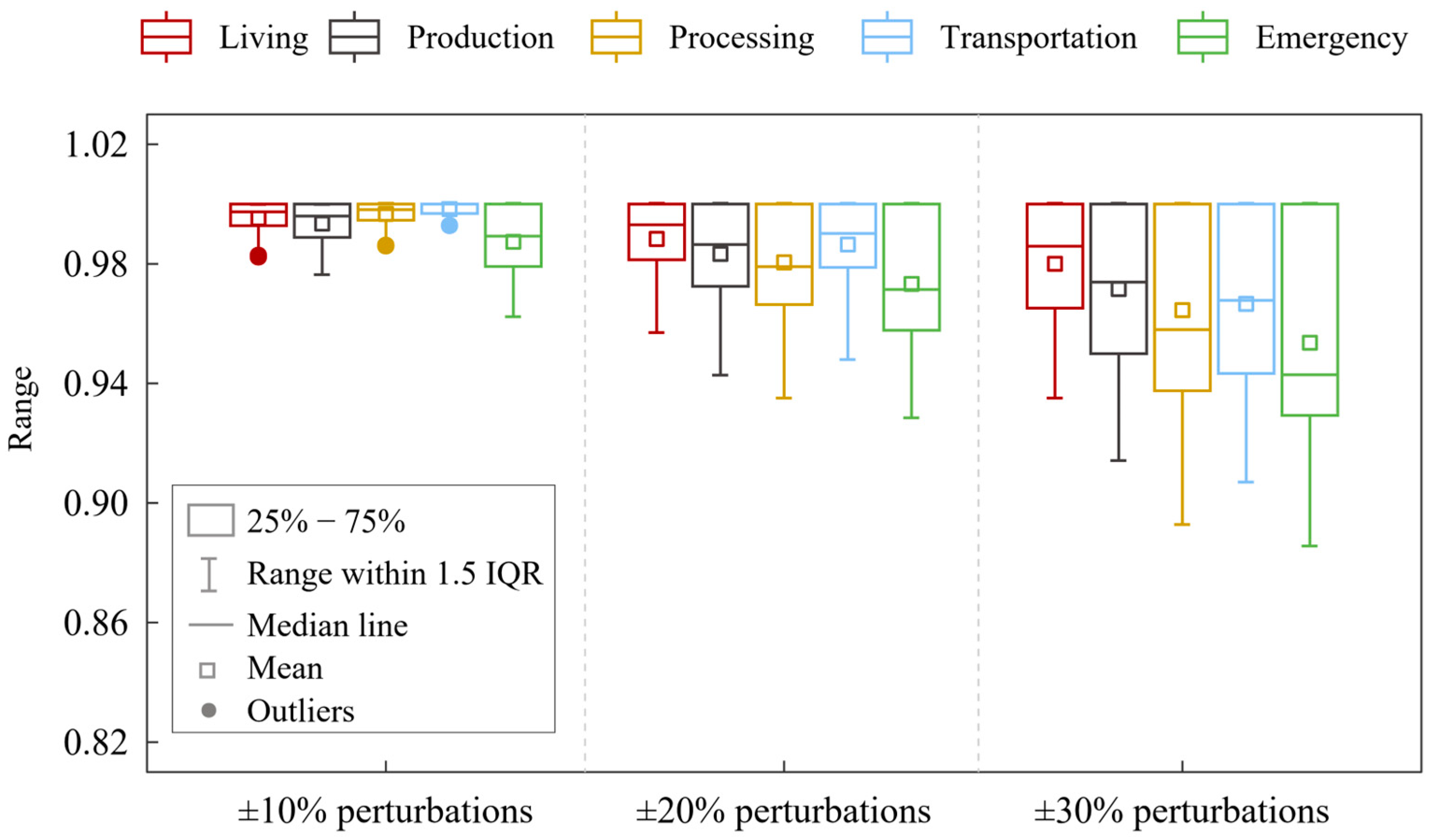 This section evaluates the resilience of decision results by applying ±10%, ±20%, or ±30% perturbations to the combined weights of each index and uses Spearman’s rank correlation coefficient to assess the ranking stability [