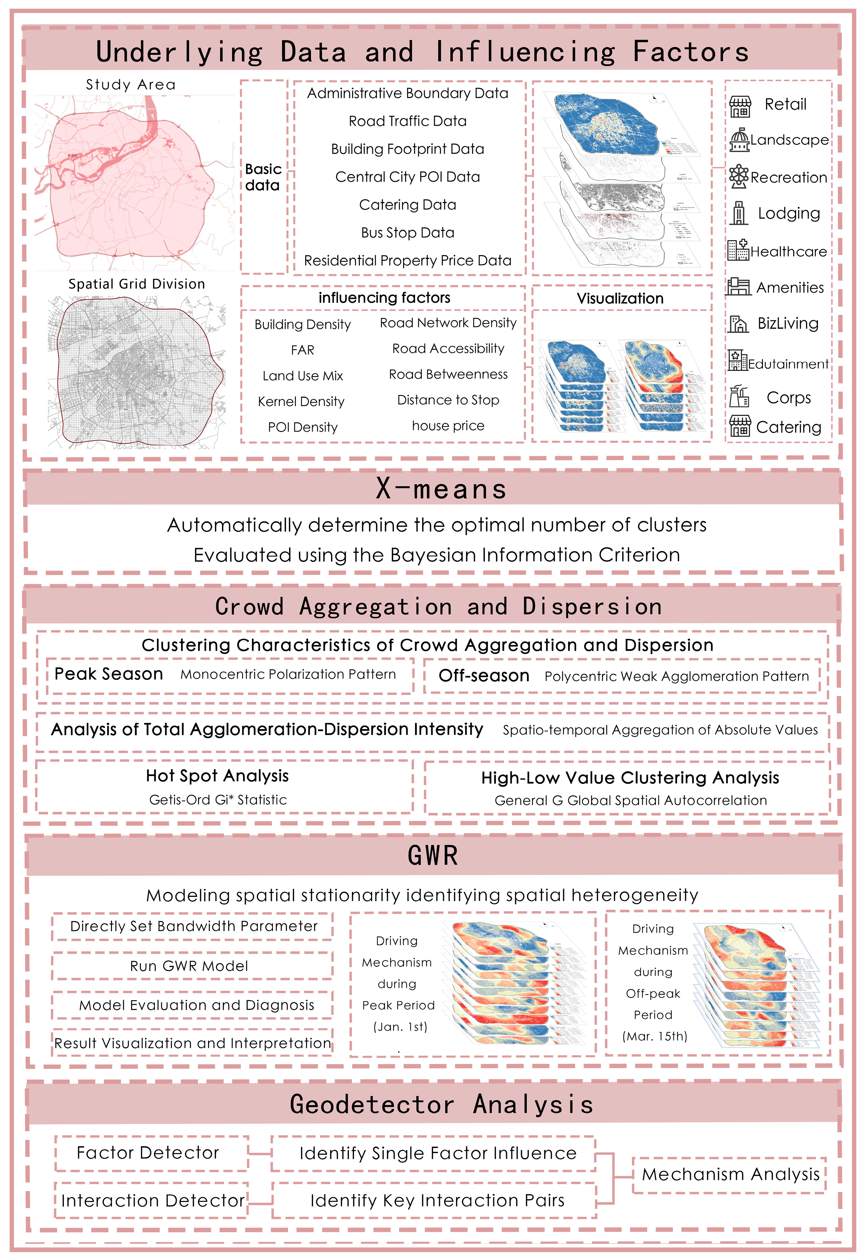 Despite these advancements, shortcomings remain: most studies stop at describing crowd mobility patterns themselves or merely conduct static correlation analyses, constrained by traditional modernist and postmodernist approaches, failing to deeply parse the influence of the micro-environment on mobility. Against this backdrop, this study introduces metamodernism as its theoretical framework, re-examining the spatiotemporal patterns of urban crowd activity from the perspective of an oscillatory ontology. Integrating multi-source spatiotemporal data such as Baidu Heatmap data, POI density, and road network accessibility, and taking Harbin, China, as the study area, this research employs the x-means clustering method to identify the spatiotemporal aggregation and dispersion characteristics of crowds during the off-season and peak holiday season in Harbin. Using the geographical detector method, it quantitatively assesses the explanatory power of various built environment and socioeconomic factors on the spatial heterogeneity of crowd aggregation/dispersion intensity and detects interactions between multiple factors, identifying key drivers. Combined with geographically weighted regression analysis, it reveals the spatiotemporally heterogeneous effects and mechanisms of built environment and socioeconomic factors on crowd aggregation/dispersion intensity, aiming to understand the underlying dynamics of urban crowd flows (Figure 1). This provides not only specific technical pathways for enhancing Harbin’s urban resilience but also achieves a dual breakthrough theoretically and methodologically: Theoretically, the study interprets crowd pulses as “dynamically anchored social kinds,” revealing their mechanism of morphological and functional transformation within seasonal rhythms, thereby elevating the understanding of urban vitality from phenomenological description to a theoretical insight into “constitutive conditions,” promoting the advancement of geographical thought towards a “post-paradigmatic” depth. Methodologically, the research breaks through the limitations of traditional global models, offering a new paradigm for understanding complex human-environment interactions. More importantly, it provides non-empiricist scientific recommendations for urban renewal, management, and spatial optimization in Harbin City, while offering technical support and methodological guidance for enhancing overall urban resilience in response to seasonal fluctuations in tourist flow.