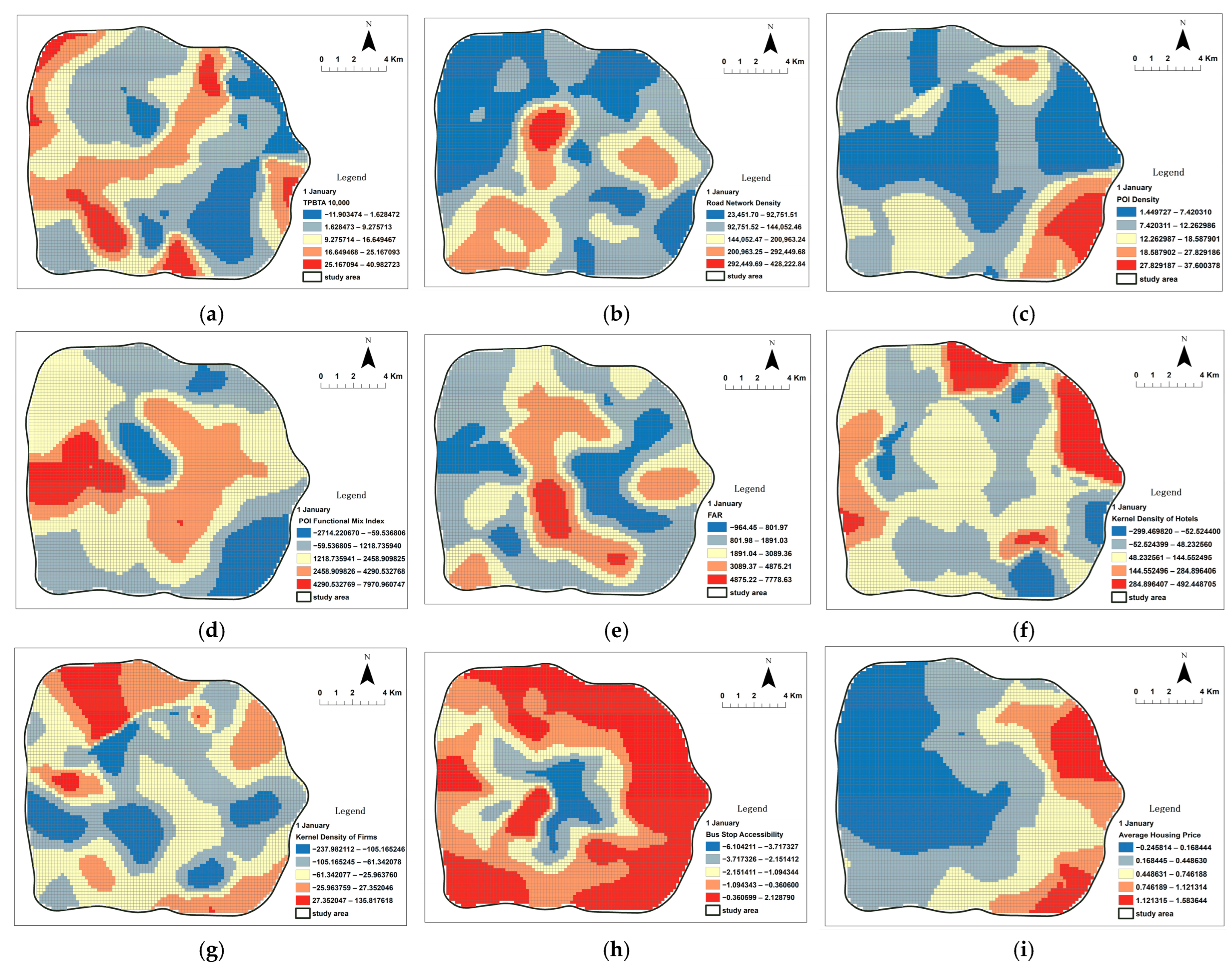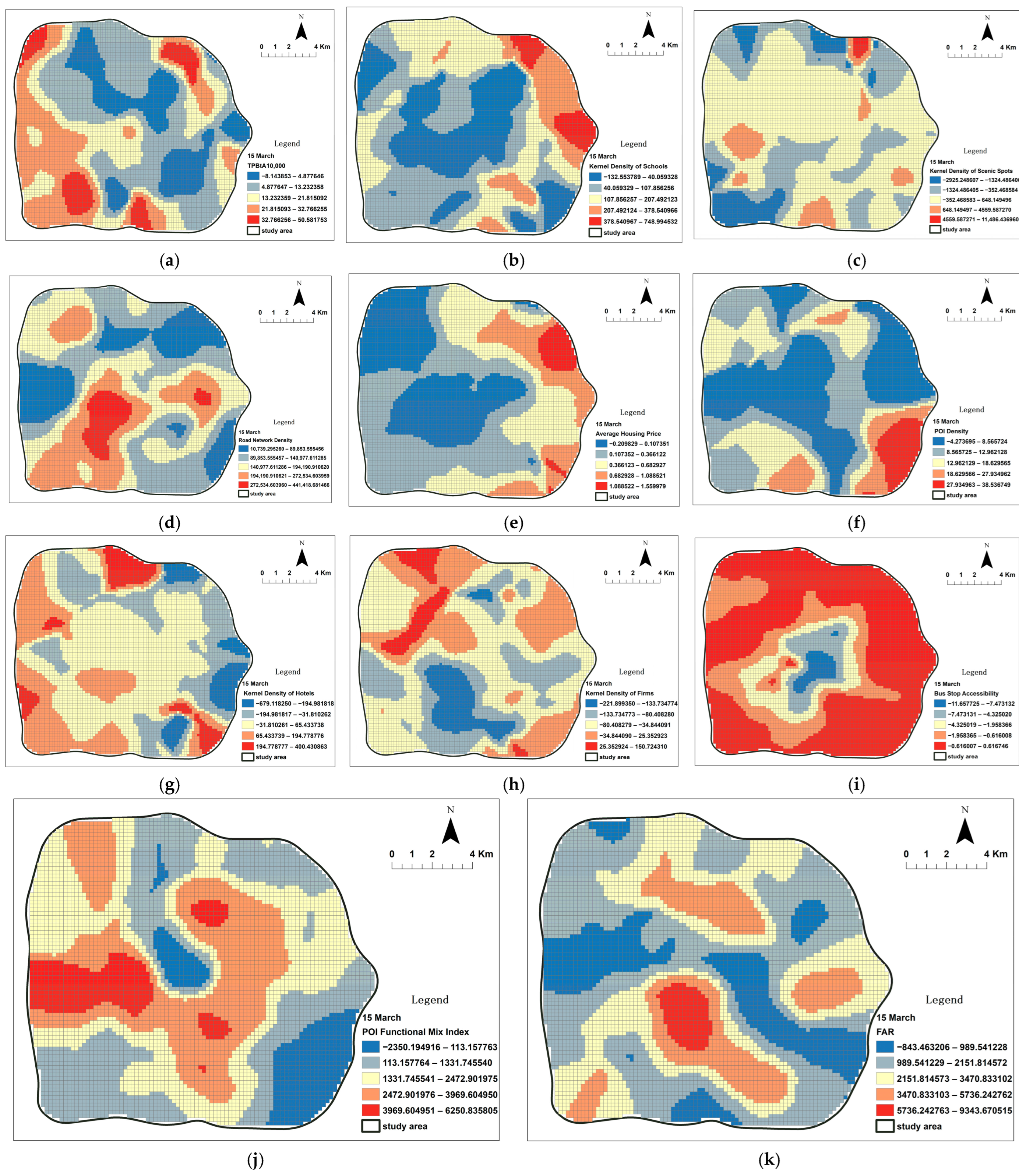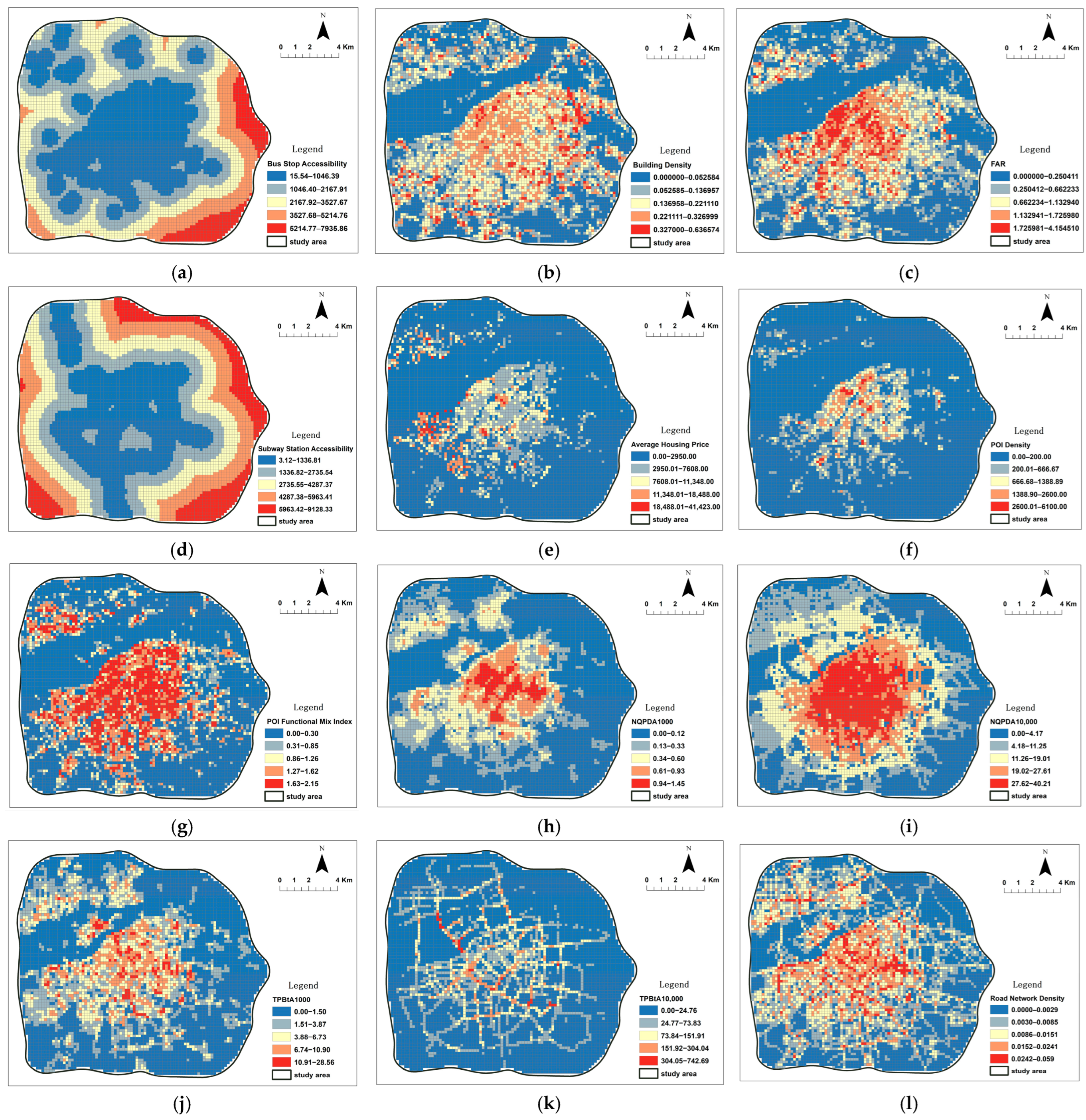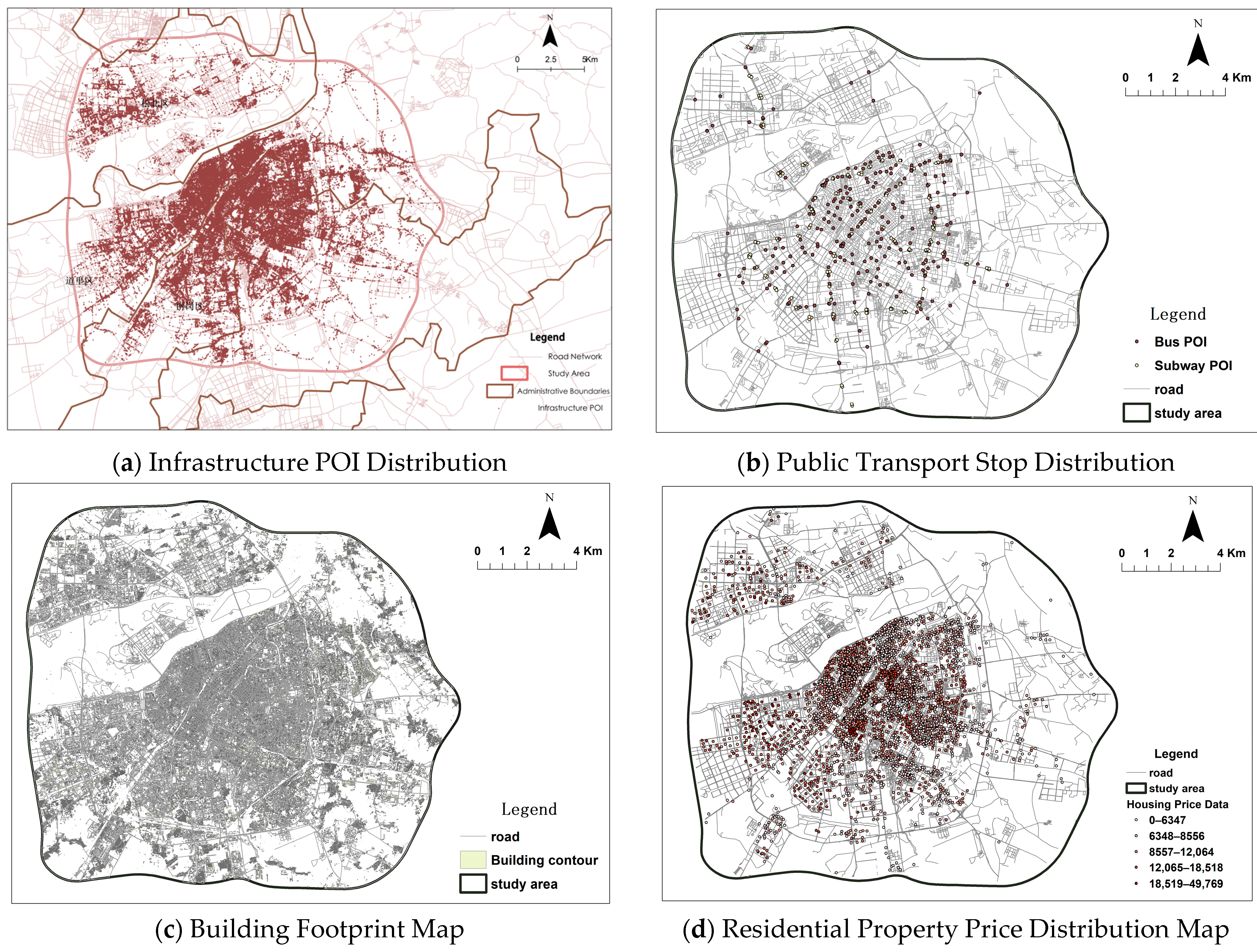The visualized fundamental geographic data, Point of Interest (POI) data, and socioeconomic data are presented in Figure 4. POI density reflects the aggregation degree of urban functions such as commerce and services (Figure 4a). The distribution of public transport stops (bus and metro) can be used to quantify the level of public transport accessibility in different areas (Figure 4b). Building footprints delineate the boundaries of urban physical space (Figure 4c). Residential property prices, serving as a proxy variable for socioeconomic status, reveal residential spatial differentiation (Figure 4d).