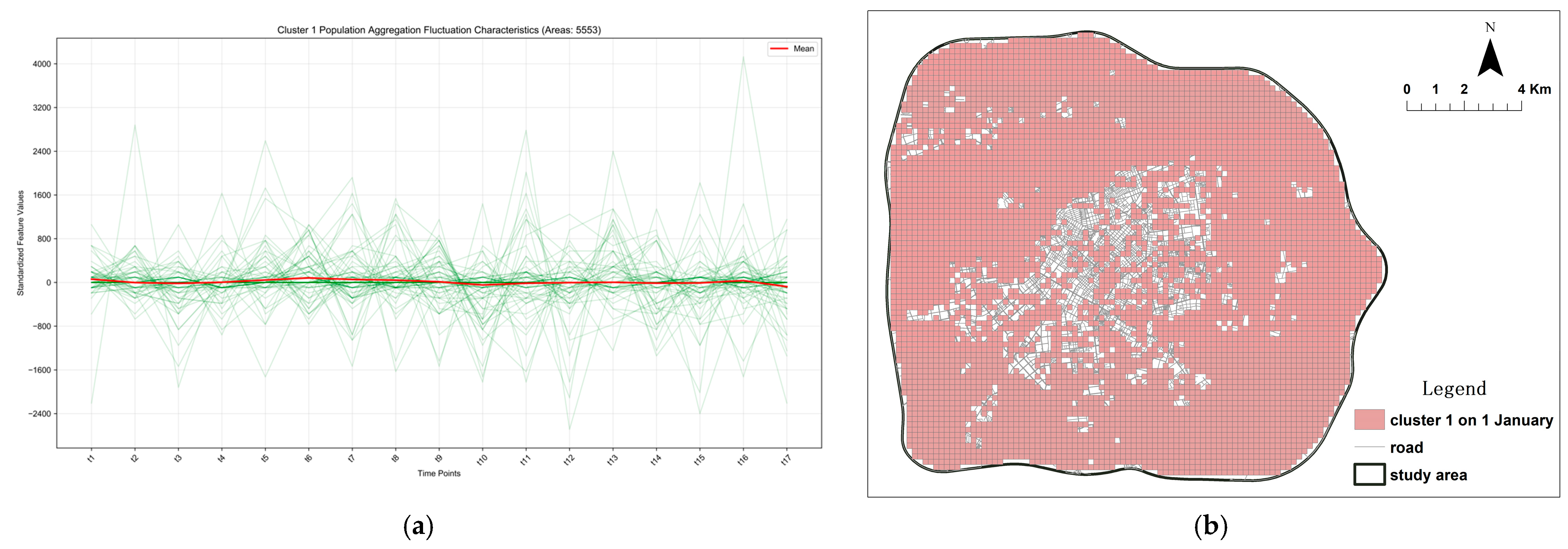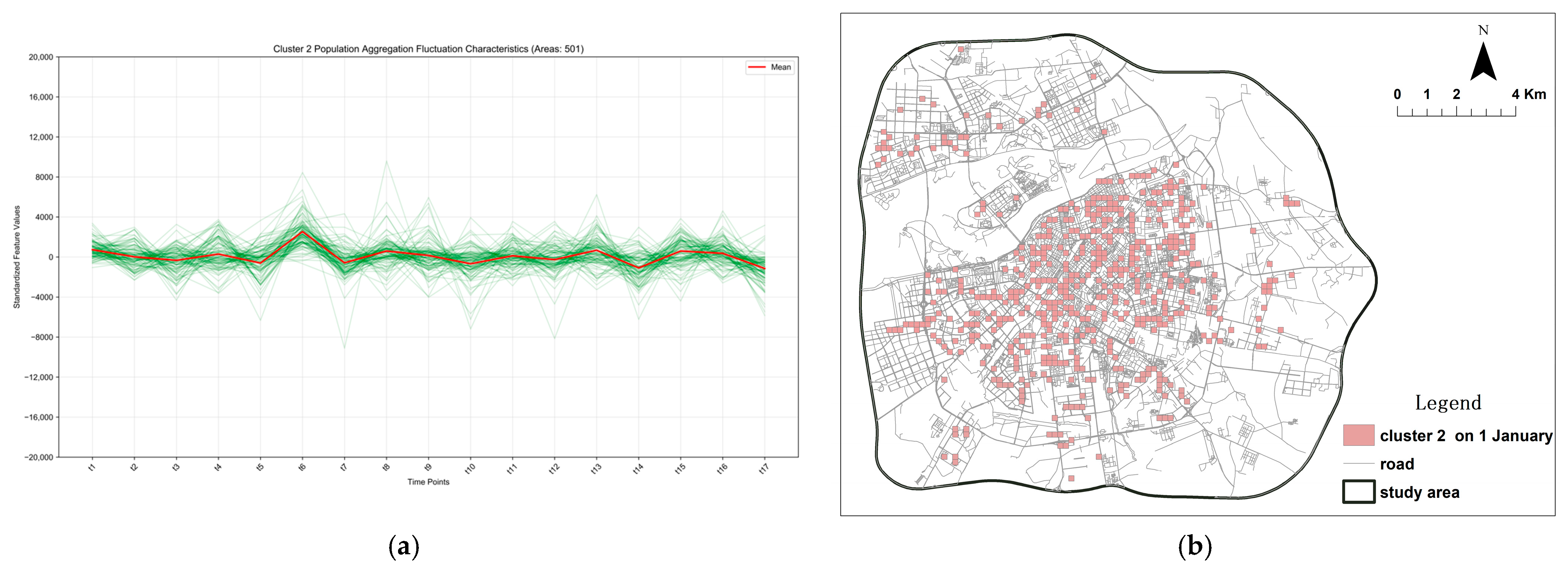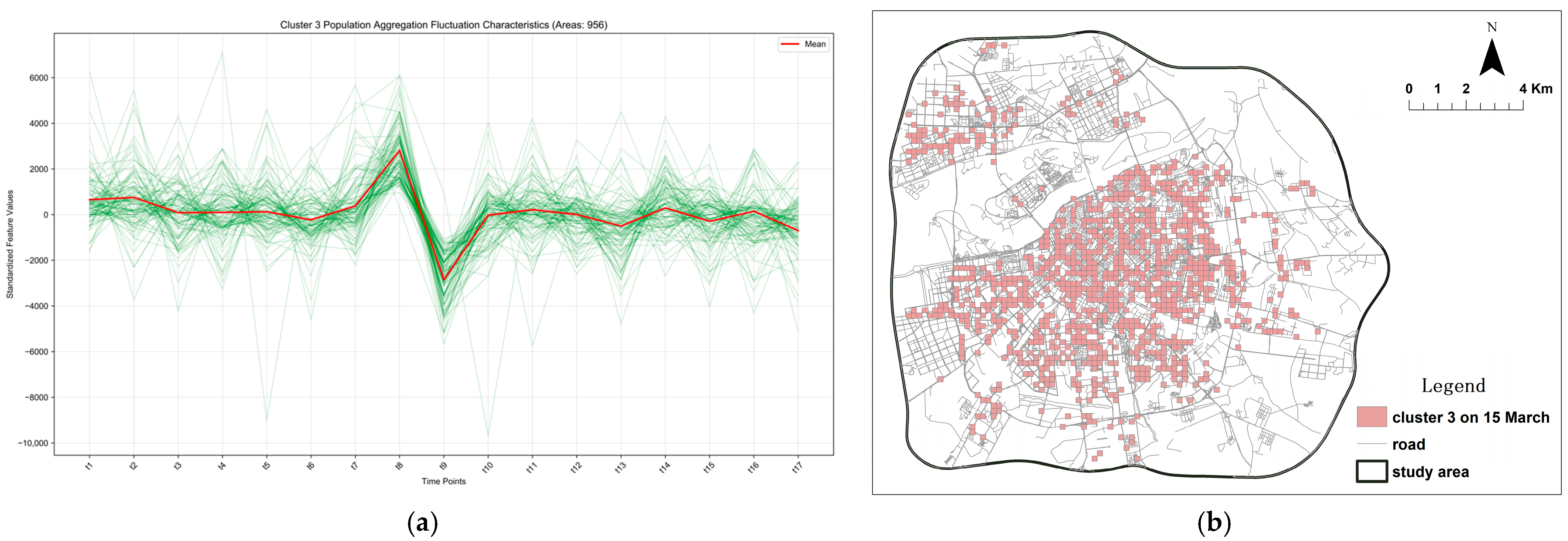 This spatiotemporal pattern significantly differs from that of Cluster 3, which is characterized by pronounced aggregation and consumption functions. Furthermore, the activity peaks in Cluster 2 lag approximately one hour behind those in Cluster 3, indicating a dependency relationship. From an urban planning perspective, incorporating independent functions into these areas is recommended to enhance their resilience.