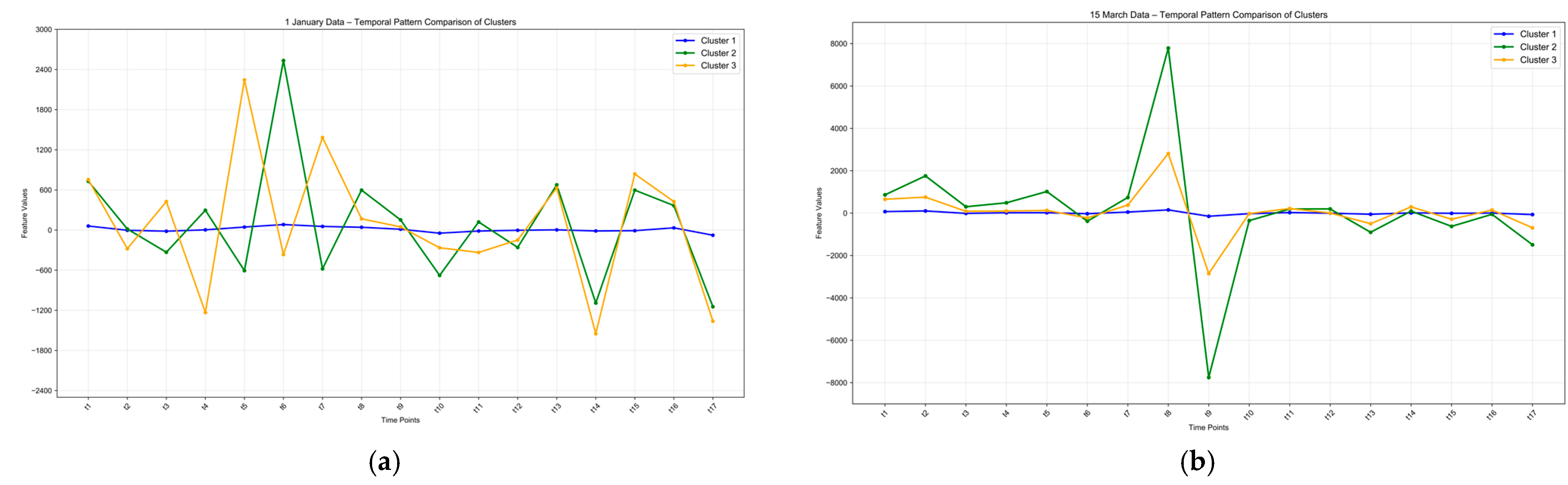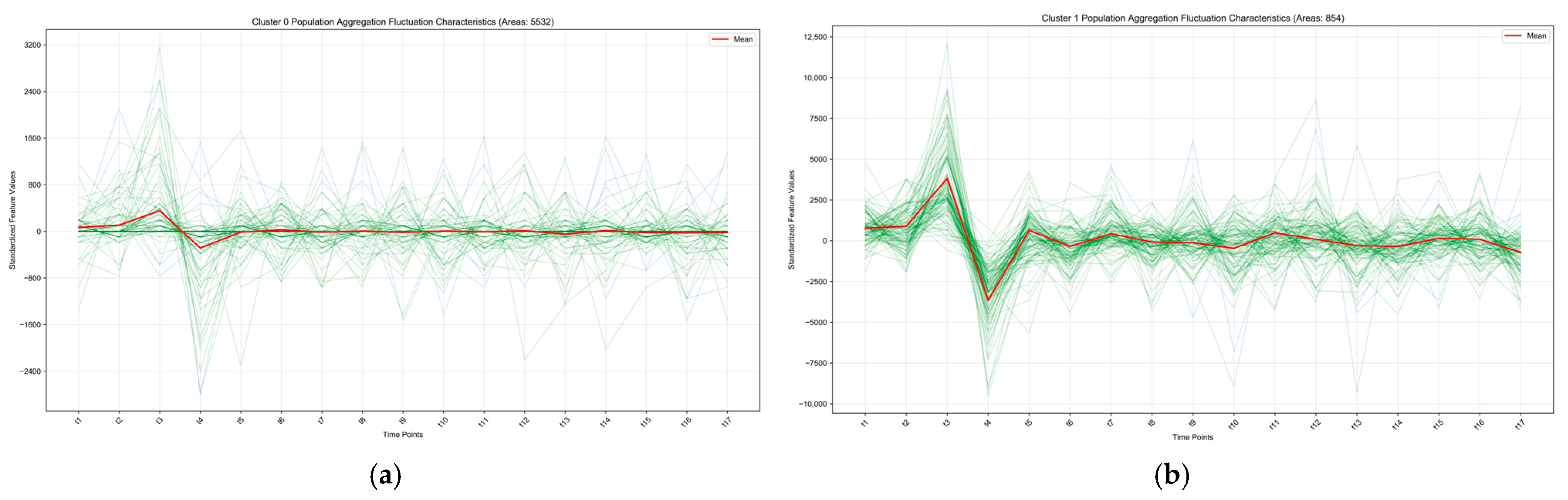 The aggregation and dispersion patterns of different clusters during peak and off-peak seasons are summarized, with results shown in Figure 13. Comparing the pedestrian flow patterns between the two periods, the peak season exhibits global fluctuations, whereas the off-peak season demonstrates local tidal patterns. During the peak season, fluctuations are more pronounced, with higher and more frequent peaks. Clusters 2 and 3 show a negative correlation during midday, indicating more dispersed pedestrian flows. Population numbers change across all areas, and the activity patterns of different groups vary significantly, reflecting a more dynamic urban environment. In contrast, off-peak urban activities are primarily driven by the daily commutes, work, and life routines of local residents. Activity patterns across different groups are highly similar, with the most intense fluctuations occurring around noon and remaining stable during other times. Population activities are more concentrated, overall characterized by low intensity and stability. During this period, the urban operational rhythm is relatively steady, pedestrian flows are more predictable, and the pressure on public services is relatively reduced.