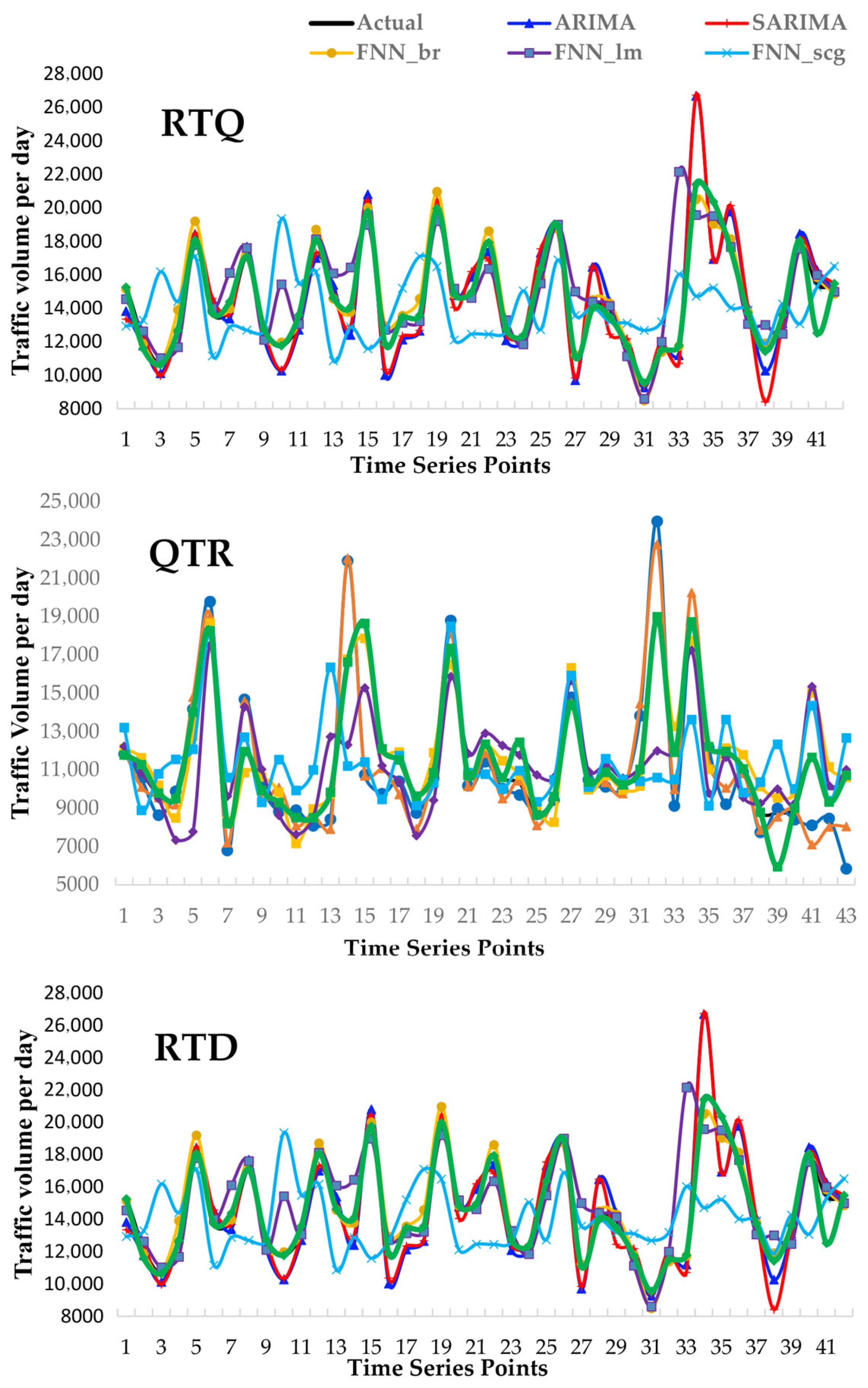 | RTQ | MAPE = 7.218% (p, D, q) = (7, 1, 2) AIC = 2.814 × 104 | MAPE = 6.836% AIC = 2.858 × 104 (p, D, q) × (ps, Ds, qs) = (7, 1, 2) × (7, 1, 3) |