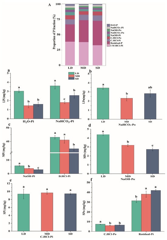 Accumulation of P fractions in soils from different salt-affected lands (A). The contents of individual P fractions were: (a) Labile inorganic P (LPi), (b) labile organic P (LPo), (c) moderately labile inorganic P (MPi), (d) moderately labile organic P (MPo), (e) stable inorganic P (SPi), and (f) stable organic P (SPo). H2O-Pi, Deionized water-extracted inorganic P; NaHCO3-Pi/Po, bicarbonate-extracted inorganic/organic P; NaOH-Pi/Po, hydroxide-extracted inorganic/organic P; D.HCl-Pi, dilute HCl-extractable inorganic P; C.HCl-Pi/Po: concentrated hydrochloric acid-extracted inorganic/organic P; Residual-Pt: residual P. Different lowercase letters indicate significant differences among saline–alkali degraded soils (p < 0.05).