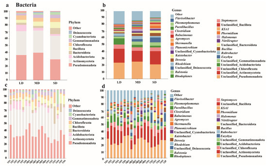 Across the three saline–alkaline soils with contrasting degradation levels, 4388 bacterial OTUs were recovered, and the bacterial assemblage was classified into 29 phyla, 71 classes, 133 orders, 196 families, and 329 genera (Figure 2). The nine dominant phyla—Pseudomonadota, Actinomycetota, Acidobacteriota, Bacteroidota, Bacillota, Chloroflexota, Gemmatimonadota, Cyanobacteriota, and Deinococcota collectively accounted for 97.98–99.27% of the sequences in each sample. Pseudomonadota and Actinomycetota were the most dominant, each with relative abundances > 30%. Along the salinization gradient, Acidobacteriota declined sharply from 9.13% under light degradation (LD) to 3.72% and 2.43% under moderate (MD) and severe degradation (SD), respectively, indicating high sensitivity to saline-alkaline stress. Conversely, the abundances of Bacteroidota, Bacillota, Gemmatimonadota, and Cyanobacteriota increased continuously with increasing stress; their proportions in SD soils were 2.95-, 2.05-, 1.76-, and 3.02-fold higher than those in LD soils, demonstrating typical halo-alkali-tolerant traits. Within the same degradation level, results from the six regional sampling sites exhibited consistent trends, indicating that the successional pattern was primarily driven by the degree of degradation.