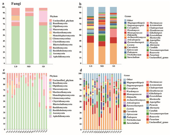 A total of 946 fungal OTUs were obtained across the three saline–alkaline soils with contrasting degradation levels. Taxonomic annotation assigned the sequences to 350 species, 260 genera, 144 families, 77 orders, 35 classes, and 13 phyla (Figure 3). At the phylum level, Ascomycota, Basidiomycota, and Chytridiomycota were the dominant groups (mean relative abundance > 1%), jointly accounting for 77.07%, 93.32%, and 94.87% of all sequences in the lightly (LD), moderately (MD), and severely (SD) degraded soils, respectively. Ascomycota was the most abundant phylum, representing 67.70%, 85.38%, and 68.77% of reads under LD, MD, and SD conditions, respectively. Mortierellomycota maintained a relative abundance of 7.69% only in the low-salinity LD soils; however, its proportion dropped below 1% in both MD and SD soils, indicating high sensitivity to elevated salinity and alkalinity. Conversely, Chytridiomycota was markedly enriched in the severely degraded SD soils, reaching 20.42% of the total sequences, approximately 10-fold higher than in the LD and MD soils, making it the most indicative fungal phylum under extreme saline-alkaline stress.
