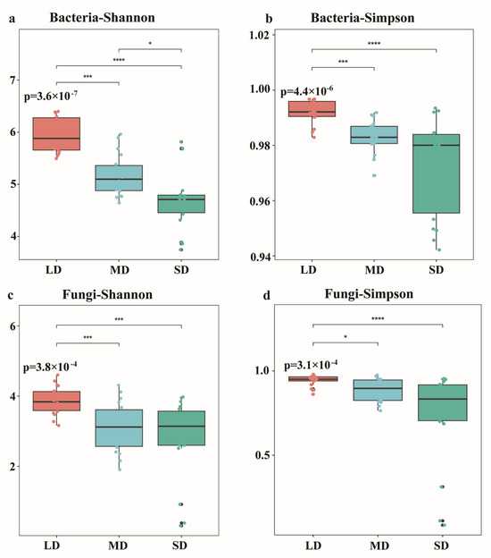 The Shannon index (a) and the Simpson index (b) of bacteria in different salt-alkali land. The Shannon index (c) and the Simpson index (d) of fungi in different salt-alkali land. P-values on each panel represent overall significance among groups (p < 0.05). Lines with asterisks (*) denote pairwise comparisons between groups. A single asterisk indicates a significant difference (p < 0.05), with further significance levels defined as follows: * p < 0.05, ** p < 0.01, *** p < 0.001, **** p < 0.0001.