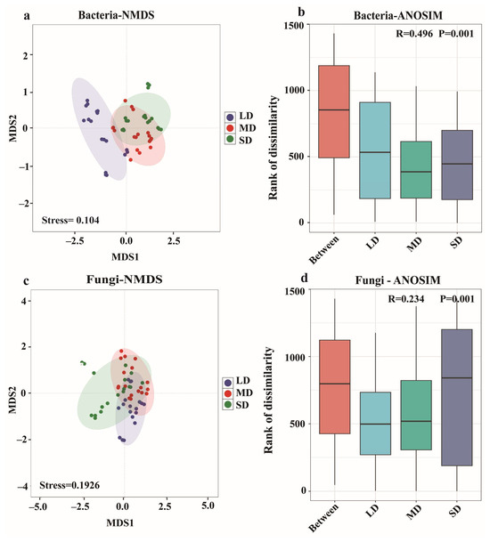 NMDS and ANOSIM analyses jointly demonstrated that the soil salinity gradient significantly influenced the divergence of microbial community structure (Figure 5). For bacteria, NMDS (stress = 0.104) showed a clear separation among the LD, MD, and SD salinity zones along the first axis, and ANOSIM further confirmed significant intergroup differences (R = 0.496, P = 0.001), indicating a strong salinity-induced filtering effect on bacterial communities. Fungal NMDS (stress = 0.1926) showed a more moderate response to salinity, with weaker separation than that observed in bacteria. Overall, salinity exerted a more pronounced influence on the bacterial community structure, whereas fungal communities displayed a weaker response, reflecting the distinct ecological adaptations of the two microbial groups under salt-stress conditions.