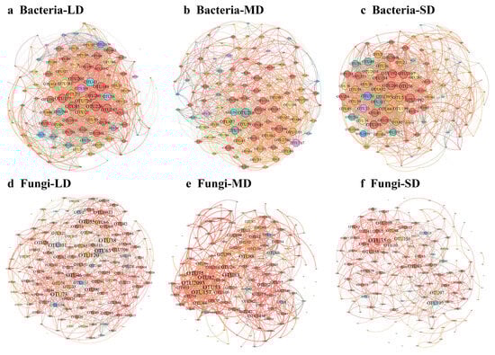 Co-occurrence networks of bacterial and fungal community in saline-alkali soils with different degrees of degradation. (a–c) represent bacterial networks, and (d–f) represent fungal networks. Nodes represent OTUs, and edges represent correlations between OTUs with Spearman’s r > 0.8 and p < 0.05. Different node colors represent different phyla. The size of the nodes was proportional to the number of connected edges.