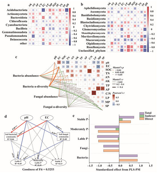 Correlation heat map between soil physicochemical properties, P fractions and bacterial (a) and fungal (b) community (phyla level). Mantel test of soil physicochemical properties, P fractions, microbial abundance and alpha-diversity (c). The width of the connecting lines corresponds to the absolute value of Mantel’s r statistic, with orange, green, and gray lines indicating significance levels of p < 0.01, 0.01 ≤ p < 0.05, and p ≥ 0.05, respectively. Partial least squares path modeling (PLS-PM) with the direct and indirect effects of soil properties and microbial communities on soil P fractions (d). Standardized direct, indirect, and total effects of each factor on soil P fractions from PLS-PM (e). Path coefficients are represented by arrow thickness, with solid arrows indicating significant paths (p < 0.05) and dashed arrows indicating non-significant paths (p > 0.05). Arrow color denotes positive (red) and negative (blue) effects. ∗, ∗∗, and ∗∗∗ represent significance levels at p < 0.05, p < 0.01, and p < 0.001, respectively. R2 values indicate the proportion of variance explained.