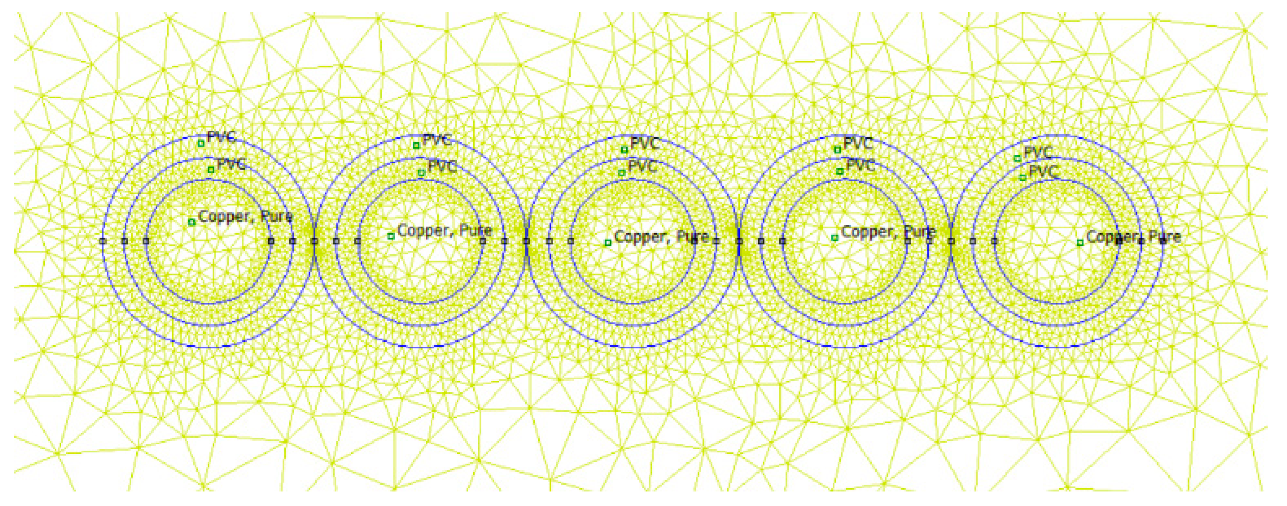Figure 2 shows an example excerpt of the FEM model with the mesh structure for the 5 × 50 cable formation. The other bundle formations were prepared in an analogous way.