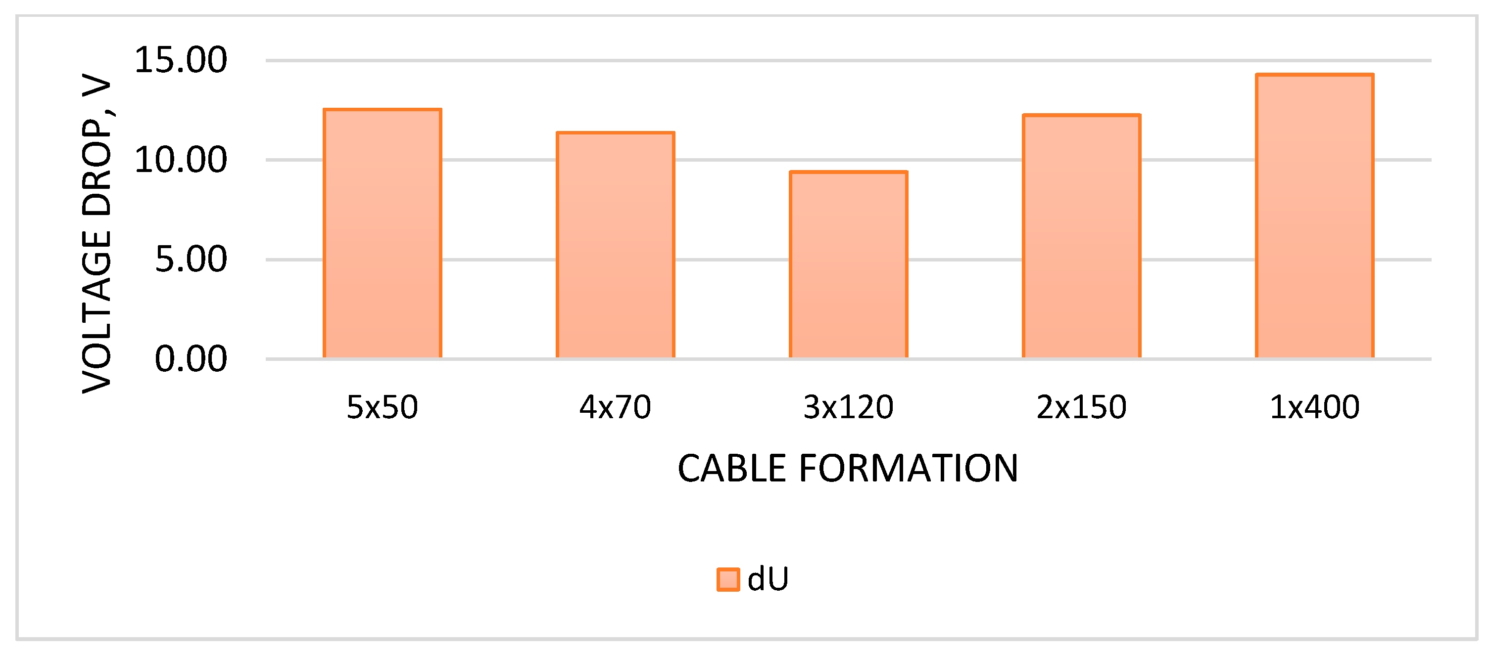 2). In addition, replacing the cable in a 1 × 400 case is more complicated than in a 1 × 50 or 1 × 70 case, due to the lower unit mass and bending radius. Bundling also allows for the possibility of overloading the supply cables for a short period, whereas with 1 × 400, the cables are overloaded due to distorted current (and therefore maximum temperature). Electrical conditions, such as voltage drop on the lines, are also checked. The values of the real and imaginary parts of the voltage drop are given in