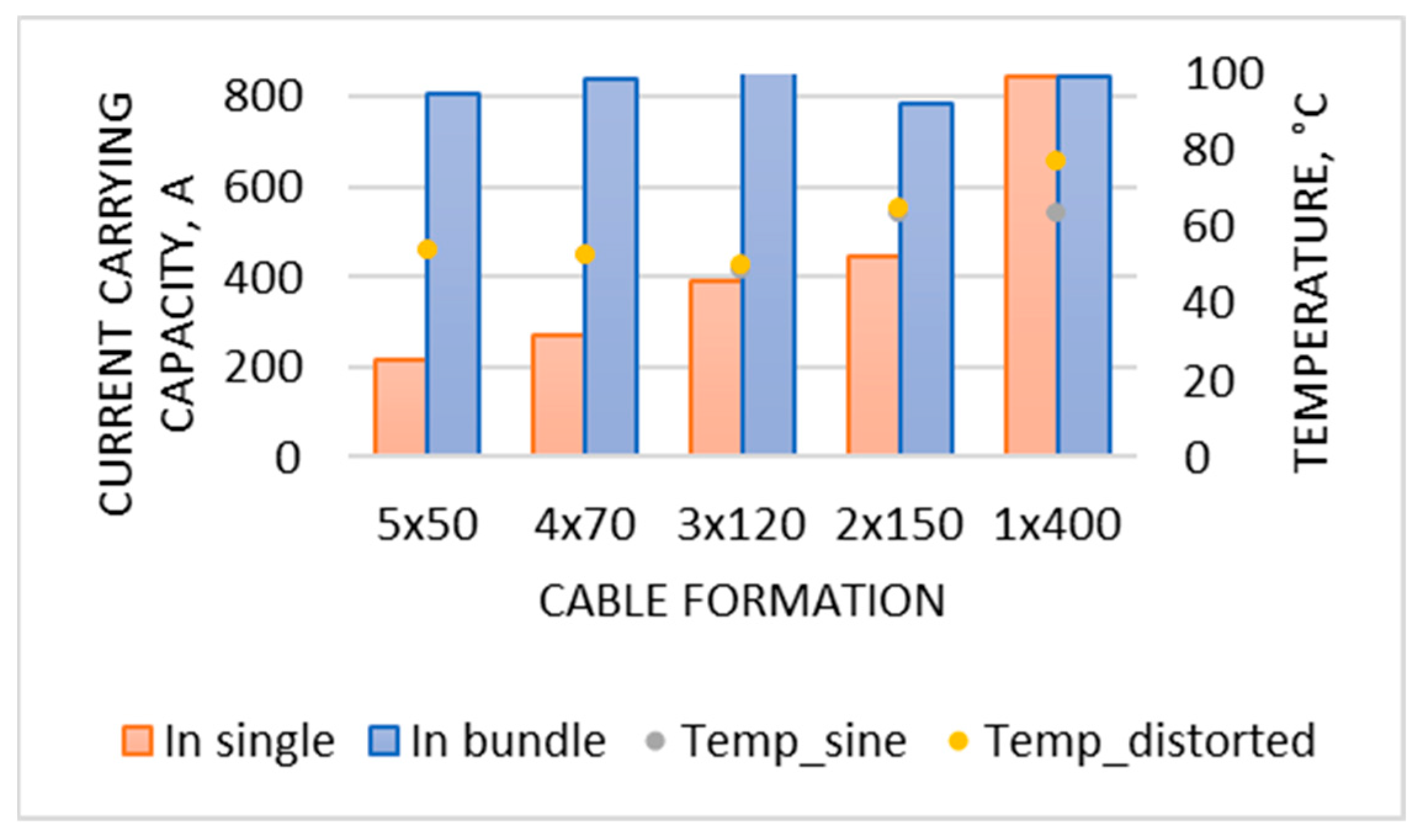 Table 10, the addition of copper utilization gives the bundles a clear advantage in this context. This results in an increase in the cost of cable trays, because the heavier the formation, the greater the load-bearing capacity of the structure. This option incurs an additional cost. In addition to investment costs, it is essential to compare running costs. For 5 × 50 and 4 × 70 formations, the difference in power losses between sinusoidal and distorted cases is negligible. However, for 1 × 400, the increase in power loss due to the skin effect is approximately 39.2% compared to the sine wave. For the 5 × 50 configuration, the power losses are approximately 12.2% and 56.1% higher than for the 1 × 400 configuration for distorted and ideal sinusoidal currents, respectively.