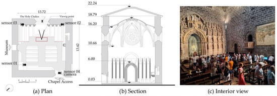 (a) Floor plan of the Holy Chalice, where the environmental sensors (black dots) and image sensor (black square) are located (heights: sensor 01: 2.00 m, sensor 02: 1.80 m; sensor 03: 1.80 m; sensor 04: 4.70 m); (b) Chapel Section with dimensions; (c) Interior view of the Chapel and altarpiece displaying the Holy Chalice. Source: Own elaboration, and photo from K. Smaha (July 2025).